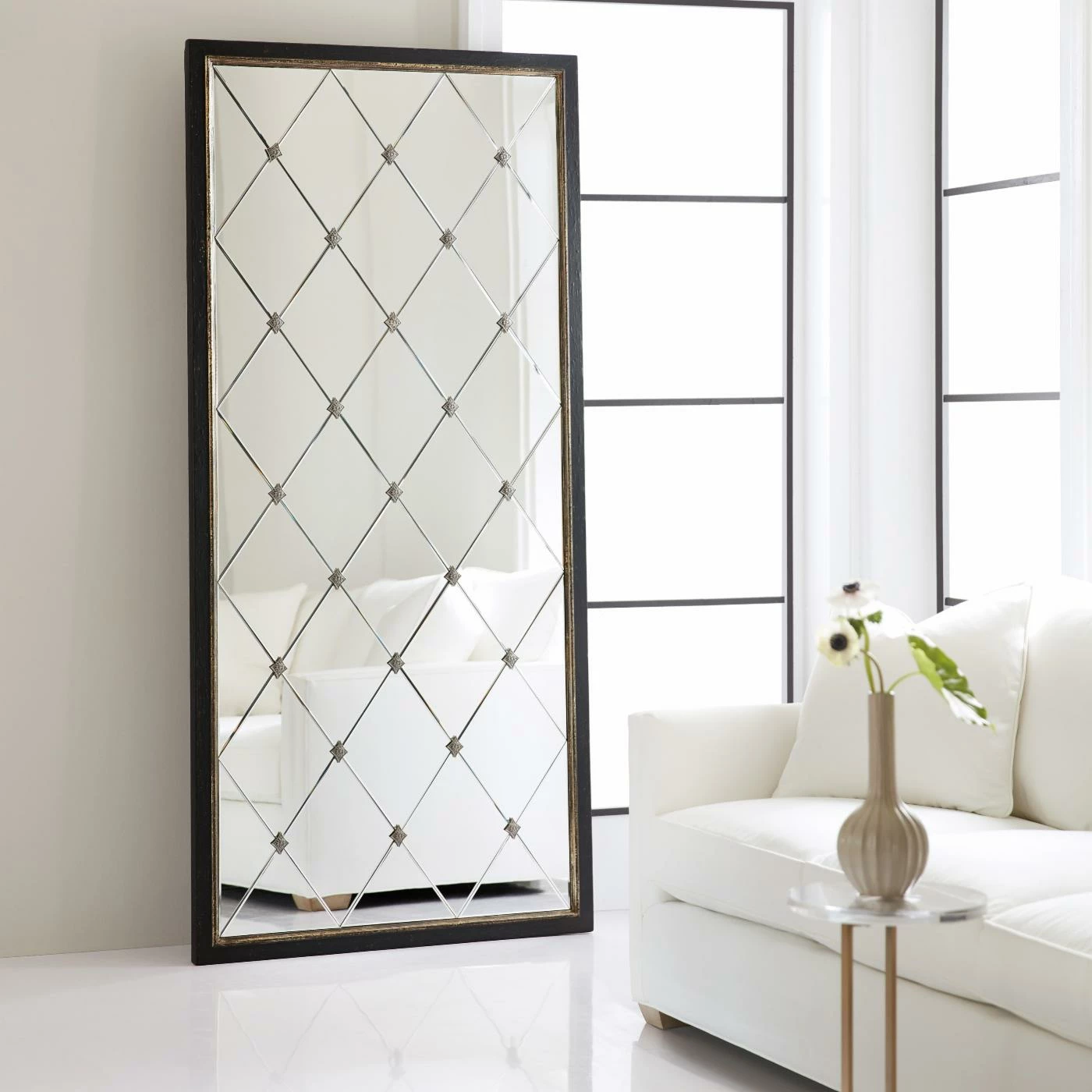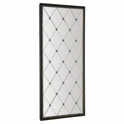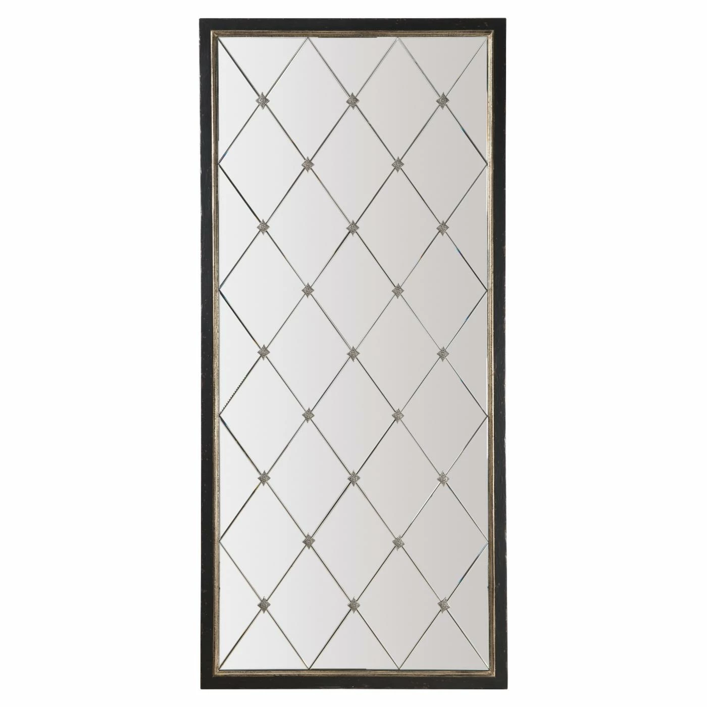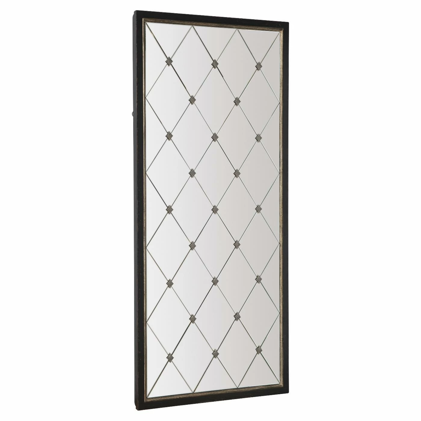 The Hooker Furniture Melange Cecilia Floor Mirror is sure to reflect your chic style. This rectangular mirror has a black finish with a line of gold finish running around the edge of the mirror. The mirror itself is comprised of diamond-shaped beveled mirrors. Decorative diamond-shaped metal accents are placed between each mirror panel. You can attach the mirror to the wall for added security (hanging hardware not included). With its sophisticated design and artistic details, this piece is sure to elevate the style of any room. Pair this item with others in the Melange Collection by Hooker Furniture on Hayneedle.com to create an elegant living space.