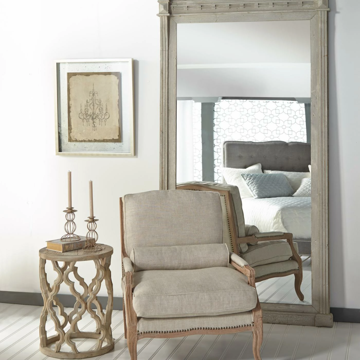 The classic design of the Orient Express Furniture Estate Floor Mirror is an ideal accent piece, whether you’re adding to existing dΓ©cor, or creating a completely new look. The frame is constructed from recycled south pine with an antique gray finish to match perfectly with almost any color combination. The intricate detailing of the frame echoes Greco-Roman columns that never go out of style. Standing at just over 89 inches high, this mirror reflects light beautifully to open up any space and bring a sense of grandeur to your home.