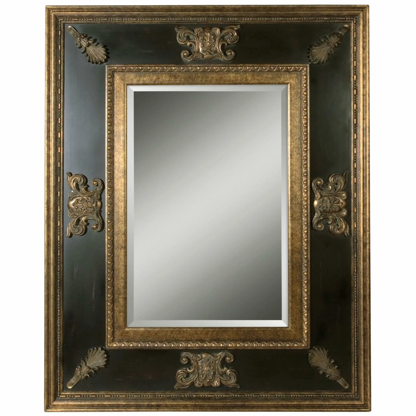 Stately decorative flourishes lend the Uttermost Cadence Mirror an air of distinction. The wide frame offers plenty of contrast, with antiqued gold-leaf edging and ornamentation that offsets the inner panels distressed black finish and green glaze beautifully. It surrounds a rectangular glass mirror with generous beveled edge. Old-fashioned and exquisite, this accent piece will serve equally well in formal dining settings, elegant bathrooms, and eclectic living rooms. It weighs 76 pounds. Hanging hardware is included.