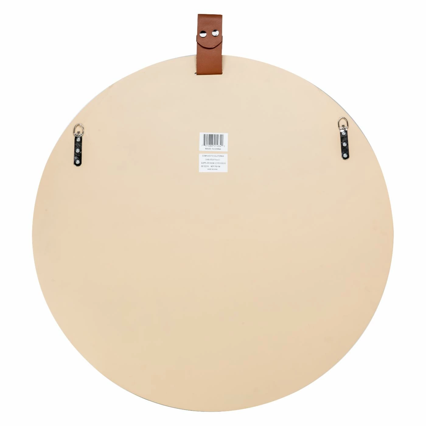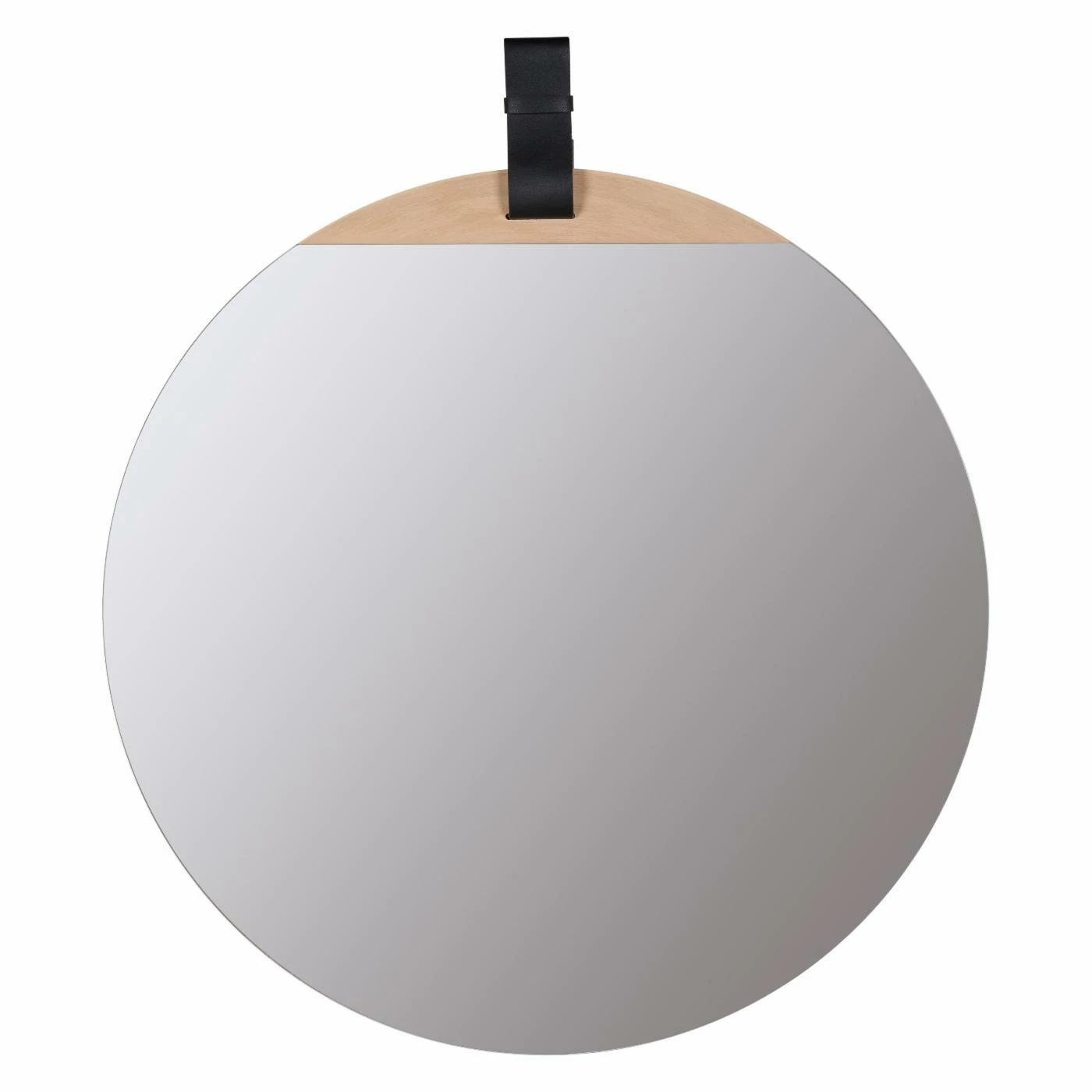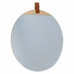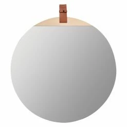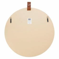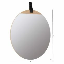 Blonde wood and dark leather accent the Cooper Classics Heppner Round Wall Mirror – 30W x 30H in. This contemporary mirror will look beautiful above your entry table or on a living room wall. The slim frame is constructed of engineered wood. It’s equipped with a hanging wire at the back for easy installation. It also comes with one black strap and one brown strap, both of which easily snap on and off the mirror, so you can use the color you prefer.