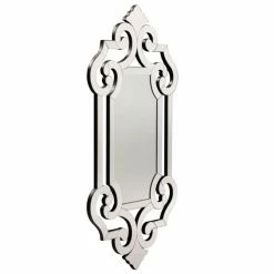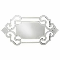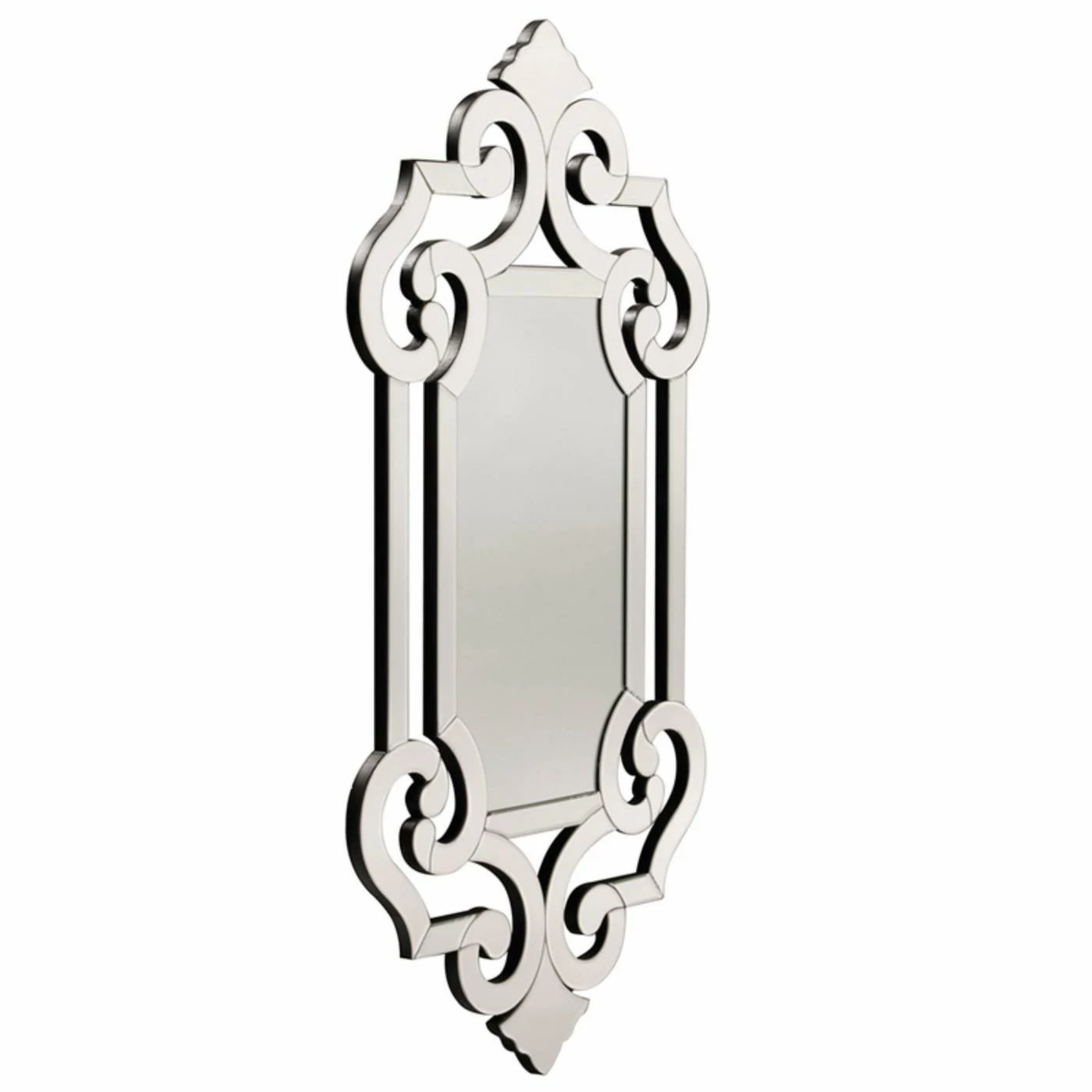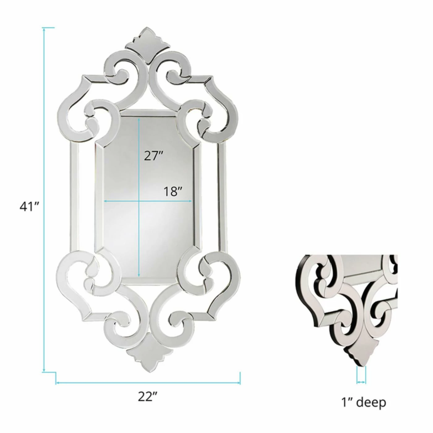 Infuse graceful design into your home with the Elizabeth Austin Clarice Frameless Wall Mirror – 22W x 41H in., boasting an intricate openwork Venetian frame. This sleek wall mirror features a fleur-de-lis at the top to bring it a royal-inspired look. Hang it in a dining room or living space to bring your home a visually striking accessory.
