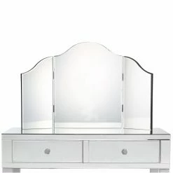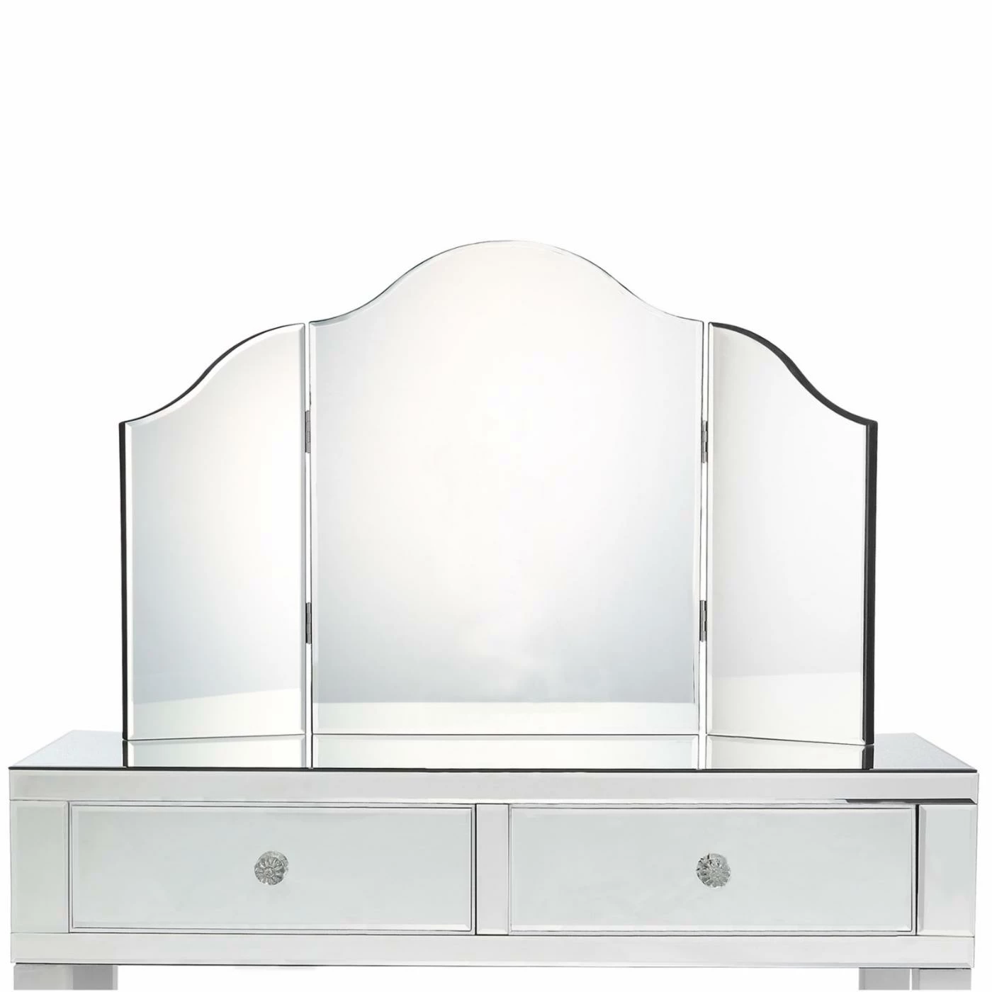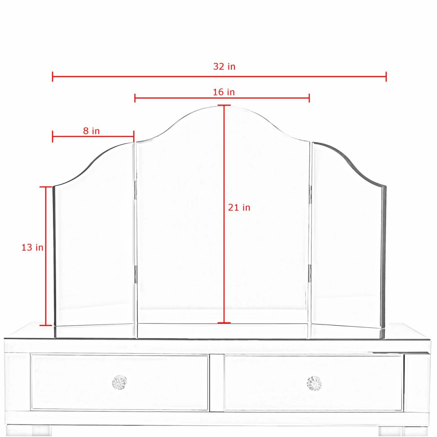 Reflect your glamorous sense of style by topping your vanity with the Inspired Home Liliana Frameless Trifold Tabletop Vanity Mirror – 32.5W x 20.9H in.. This trifold mirror features curved details along the top edge. Each piece is hinged, allowing you to adjust the position of the side panels. No assembly required.