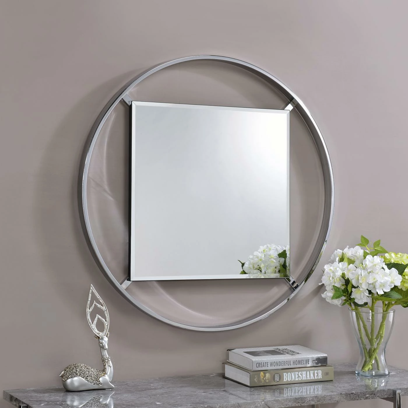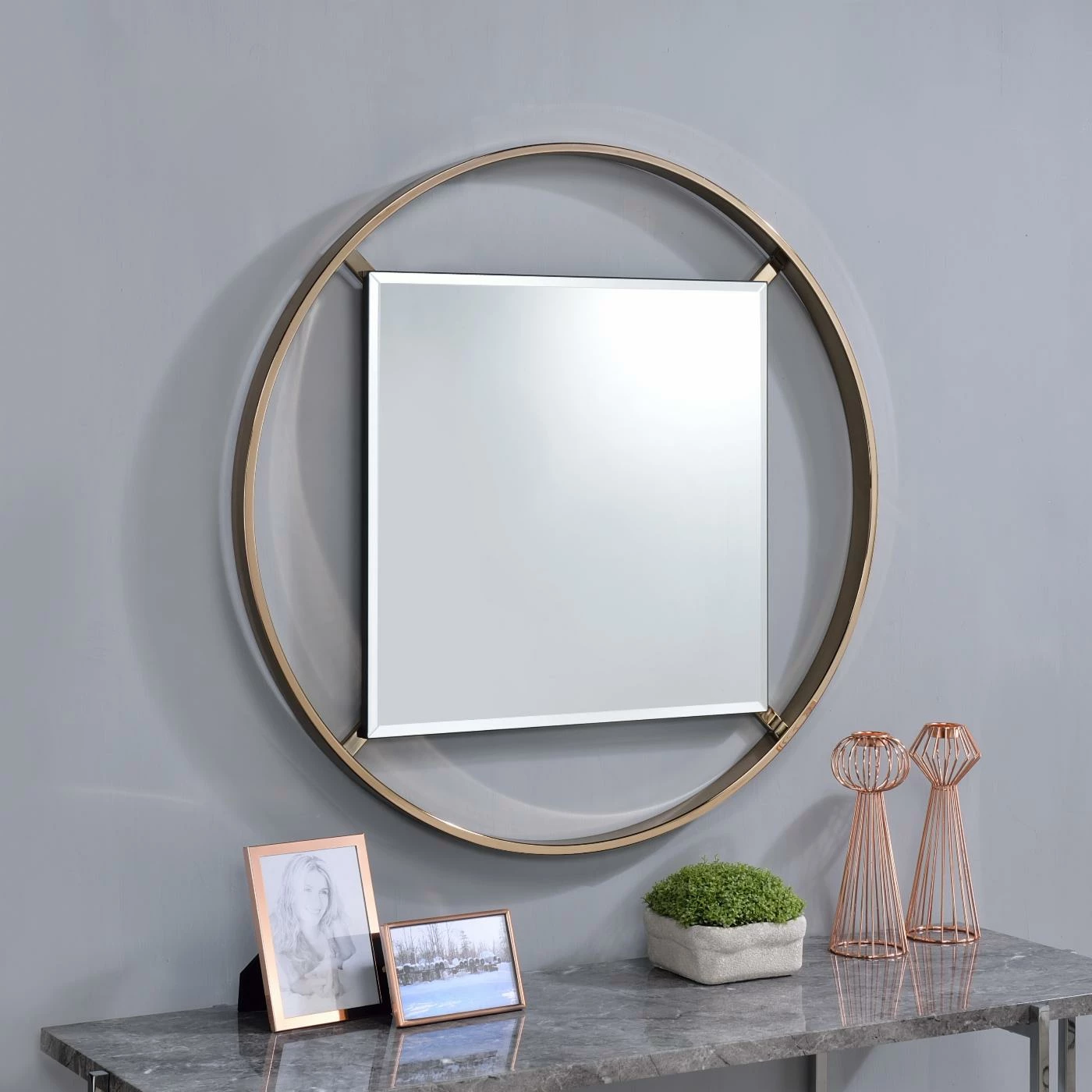 A metal ring frame set with a square, beveled edge mirror gives the Furniture of America Norman Beveled Wall Mirror – 33W x 33H in. its modern shimmer and shine. Customize its style by choosing from available metallic frame finish options. Hang this striking mirror on the wall over your entryway console table or dining server.