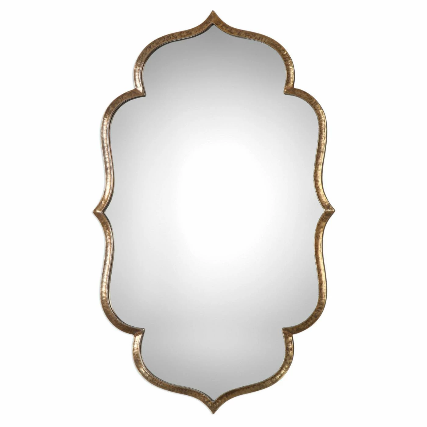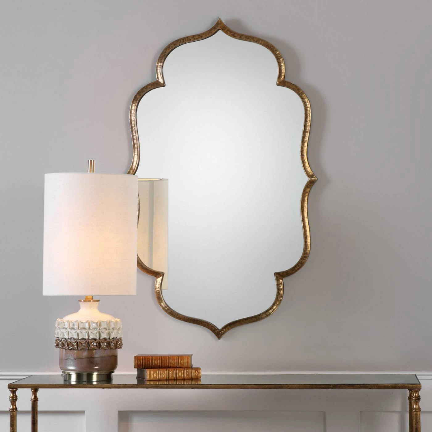 Taking its cue from Moroccan influence, the HN Home Arcata Boho Quatrefoil Gold Wall Mirror is a true statement-making piece for your walls. This large mirror has curvy edges and a sturdy frame hand crafted from hammered iron. The lightly antiqued metallic gold finish brings the mirror a graceful shimmer, and it can be hung vertically or horizontally to get the look you choose.