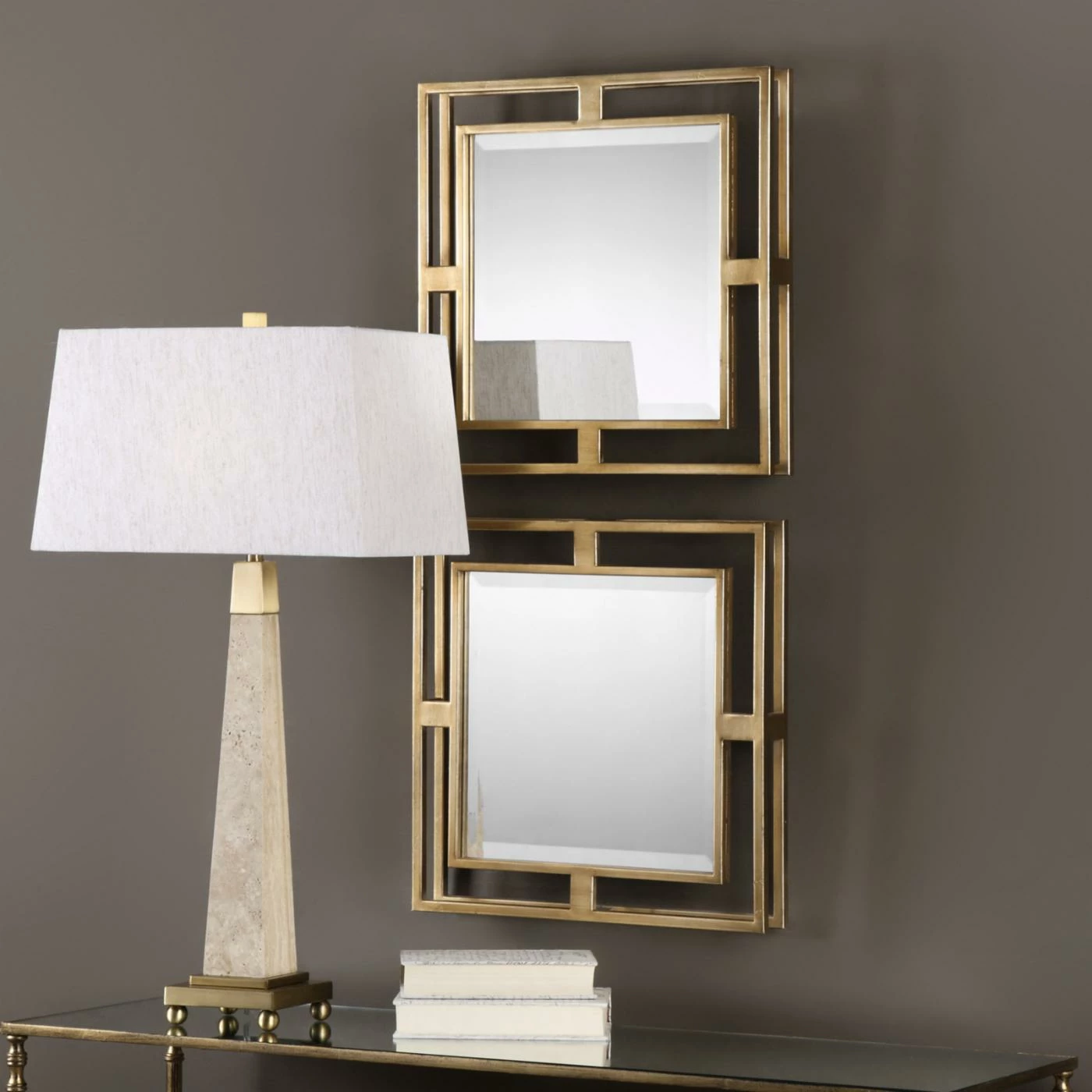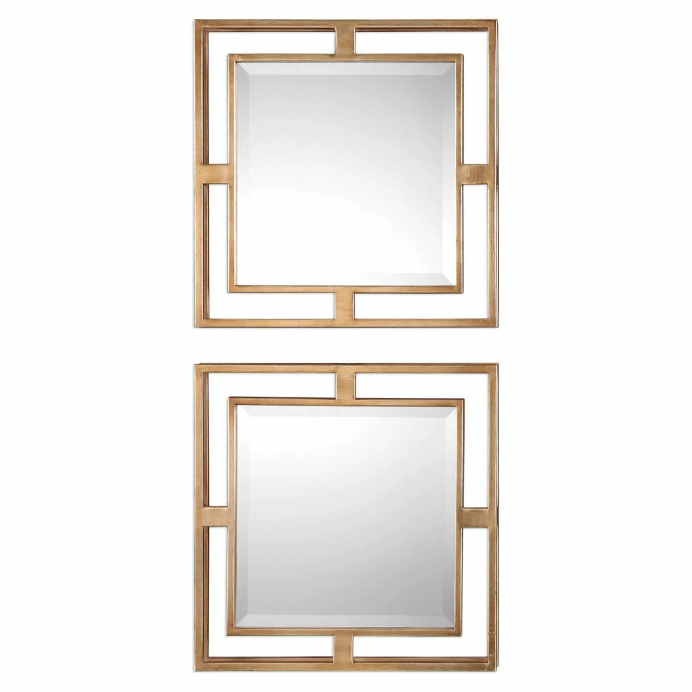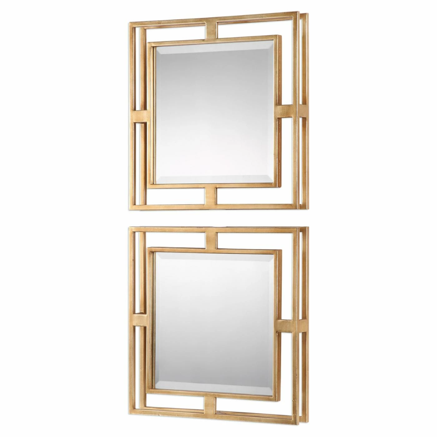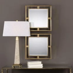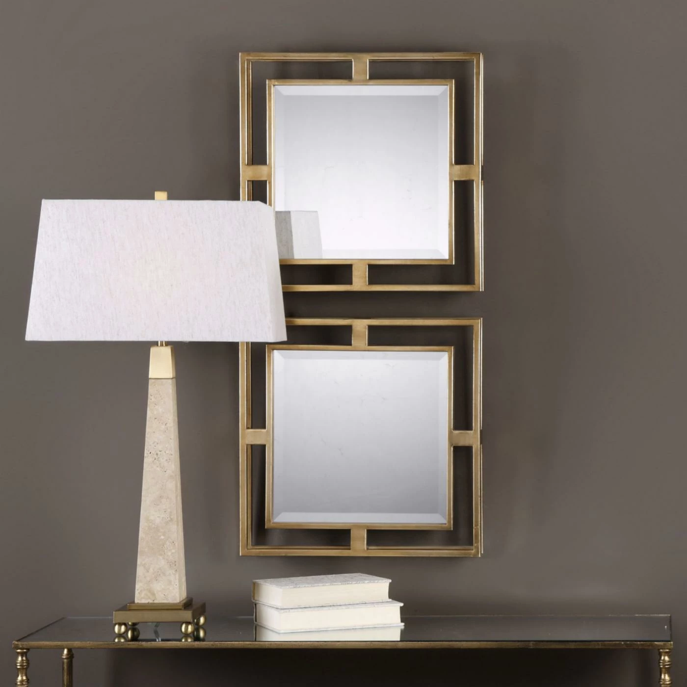 The HN Home Asheville Boho Gold Square Wall Mirrors – Set of 2 can be hung side-by-side or atop one another to give your chosen room a customized look. This pair of modern square-shaped mirrors boasts a lovely beveled edge and a forged iron frame. The frames have been hand-finished in a glamorous antiqued gold leaf, and the mirrors have a unique three-dimensional look that brings depth and texture to your walls.