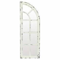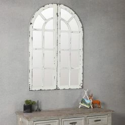 Patterned after a vintage window, the LuxenHome Arched Window Panel Wall Mirror – 16W x 47H in. – Set of 2 showcases a genuinely antique look. This wall mirror is finished in white and adorned with distressed features that enhance its weathered appearance.
