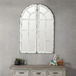 Patterned after a vintage window, the LuxenHome Arched Window Panel Wall Mirror – 16W x 47H in. – Set of 2 showcases a genuinely antique look. This wall mirror is finished in white and adorned with distressed features that enhance its weathered appearance.