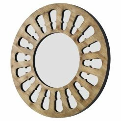 Add rustic farmhouse style to your home with the Manor Park Round Wall Mirror – 32. diam. x 2D in.Β Crafted from wood and engineered wood with a natural finish, this mirror complements any home handsomely. The cut-out design adds a unique look youβll love. Hanging hardware is included.
