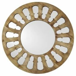 Add rustic farmhouse style to your home with the Manor Park Round Wall Mirror – 32. diam. x 2D in.Β Crafted from wood and engineered wood with a natural finish, this mirror complements any home handsomely. The cut-out design adds a unique look youβll love. Hanging hardware is included.