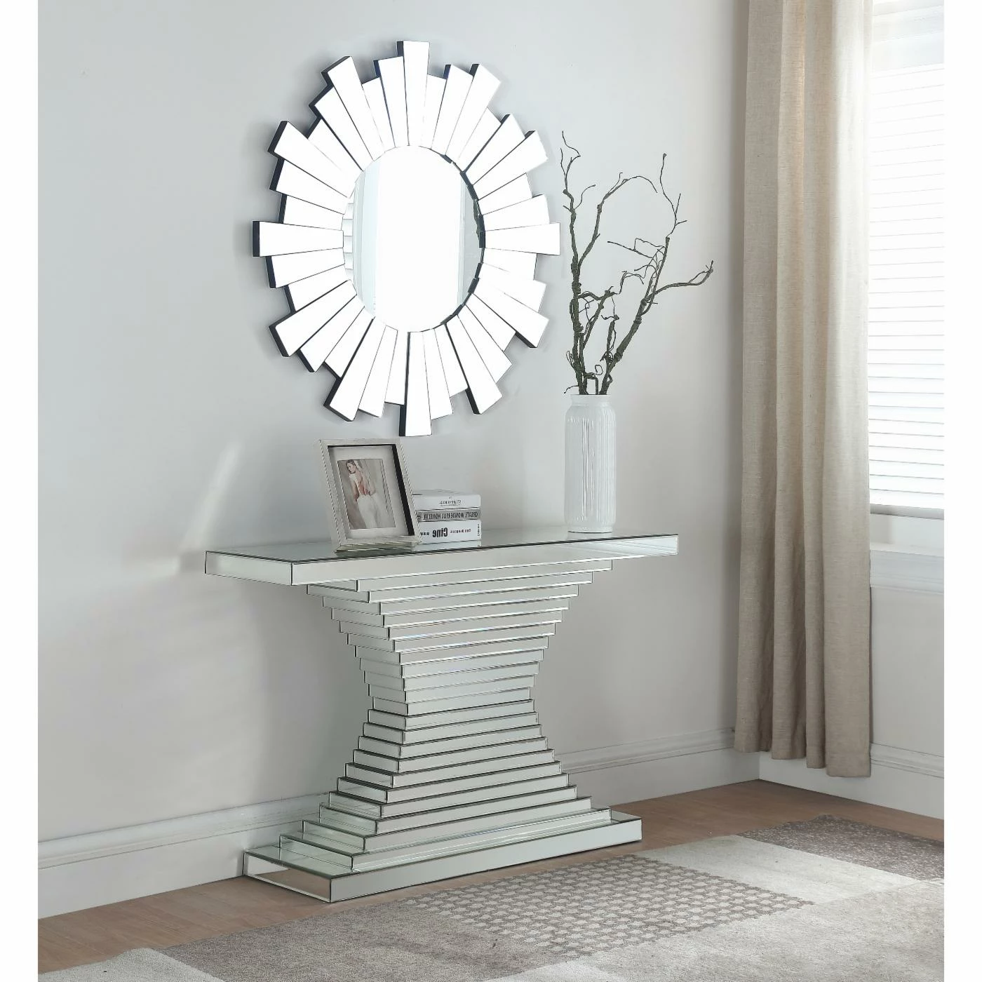 Staggered mirror panels radiate from the Meridian Furniture Inc Nexus Wall Mirror – 36 diam. in., making it as dazzling as the sun. This grand wall mirror measures three feet across and features a circular mirror at its heart. Use it to decorate any room or pair it with the Nexus Console Table for twice the style.