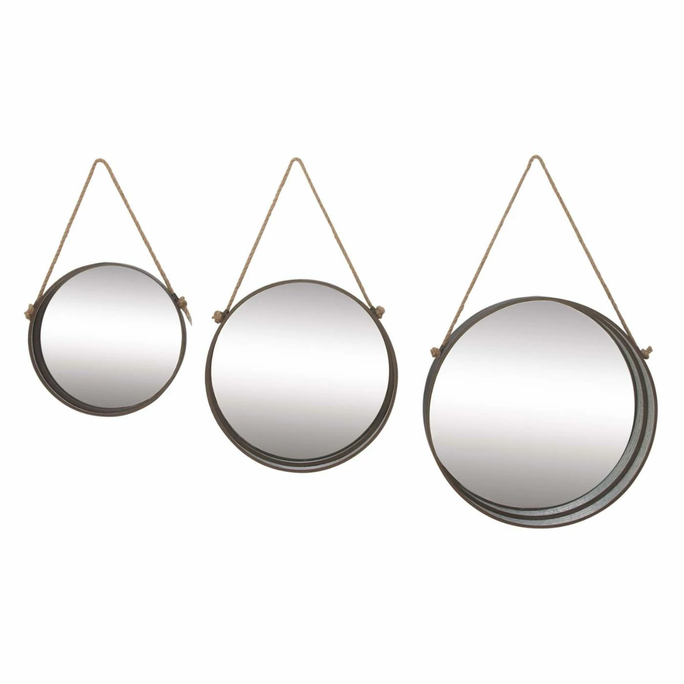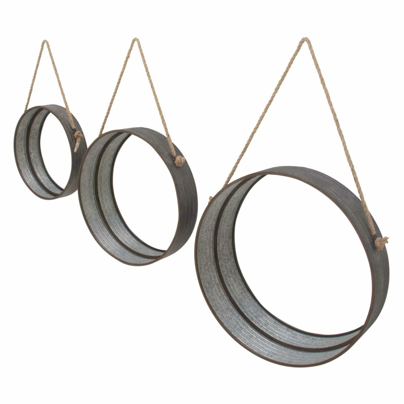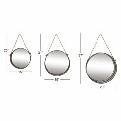 The DecMode Round Aluminum and Wood Hanging Wall Mirrors – Set of 3 adds style and function to your space. This trio of wall mirrors come in three complementary sizes. Each mirror boasts an engineered wood and aluminum construction accented by a hanging rope, which adds a rustic finish to any dรฉcor.