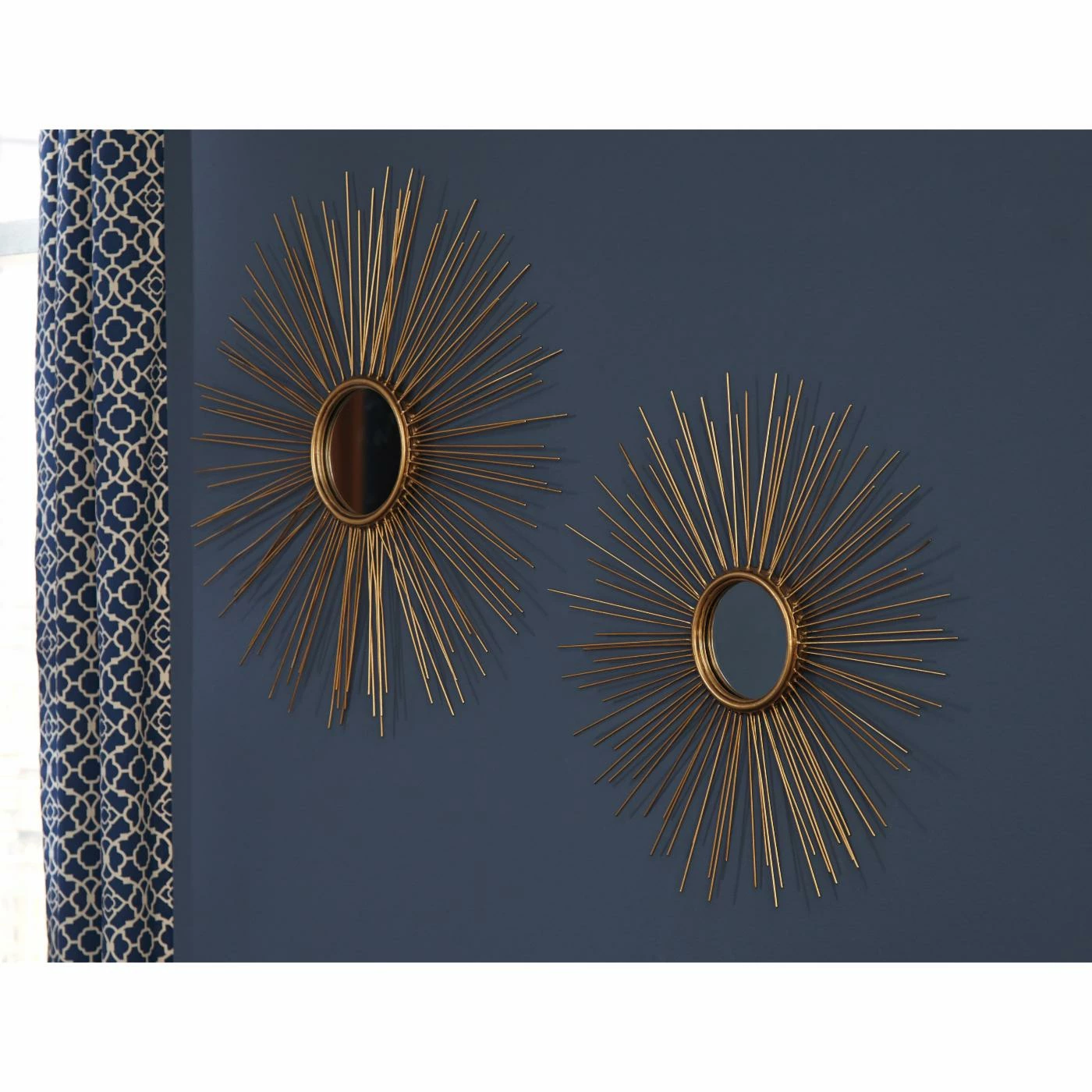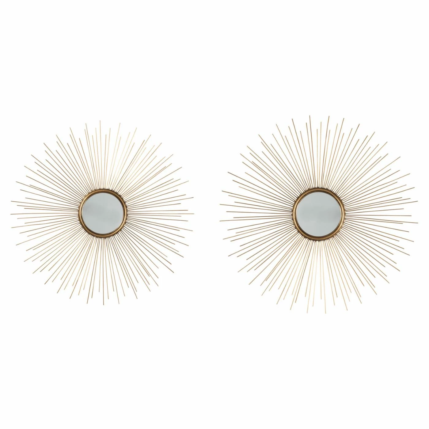 Add a burst of energy to your living space with the Doniel Accent Wall Mirror – Set of 2. This pair of stunning mirrors feature metal spokes radiating out from the center mirror in a starburst design. Each mirror is finished in antique gold to lend style and sophistication to your space. Hang together or separately using the included hardware.