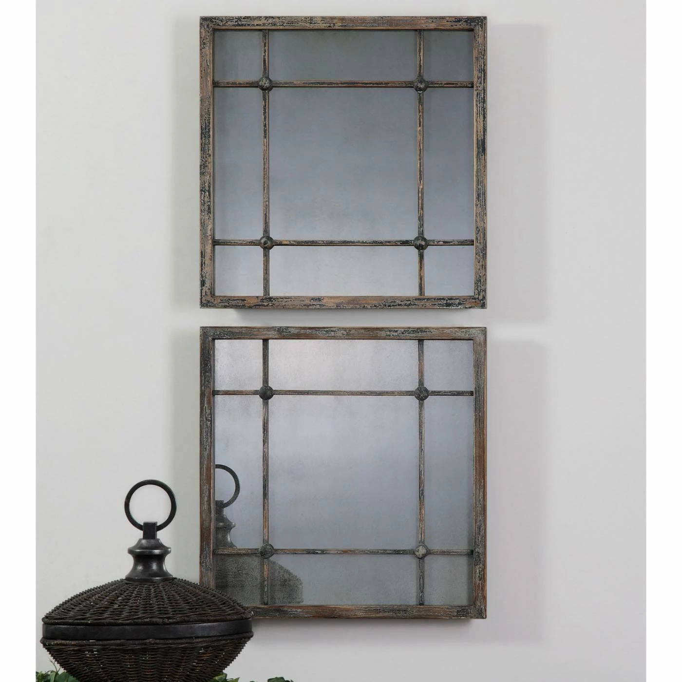 The Uttermost Saragano Square Mirrors โ Set of 2 โ 19W x 19H in. is an antiqued pair featuring heavily distressed wood frames. Each aged mirror displays worn ivory accents and a subtle, slate blue finish that has the look of being slowly erased by time.