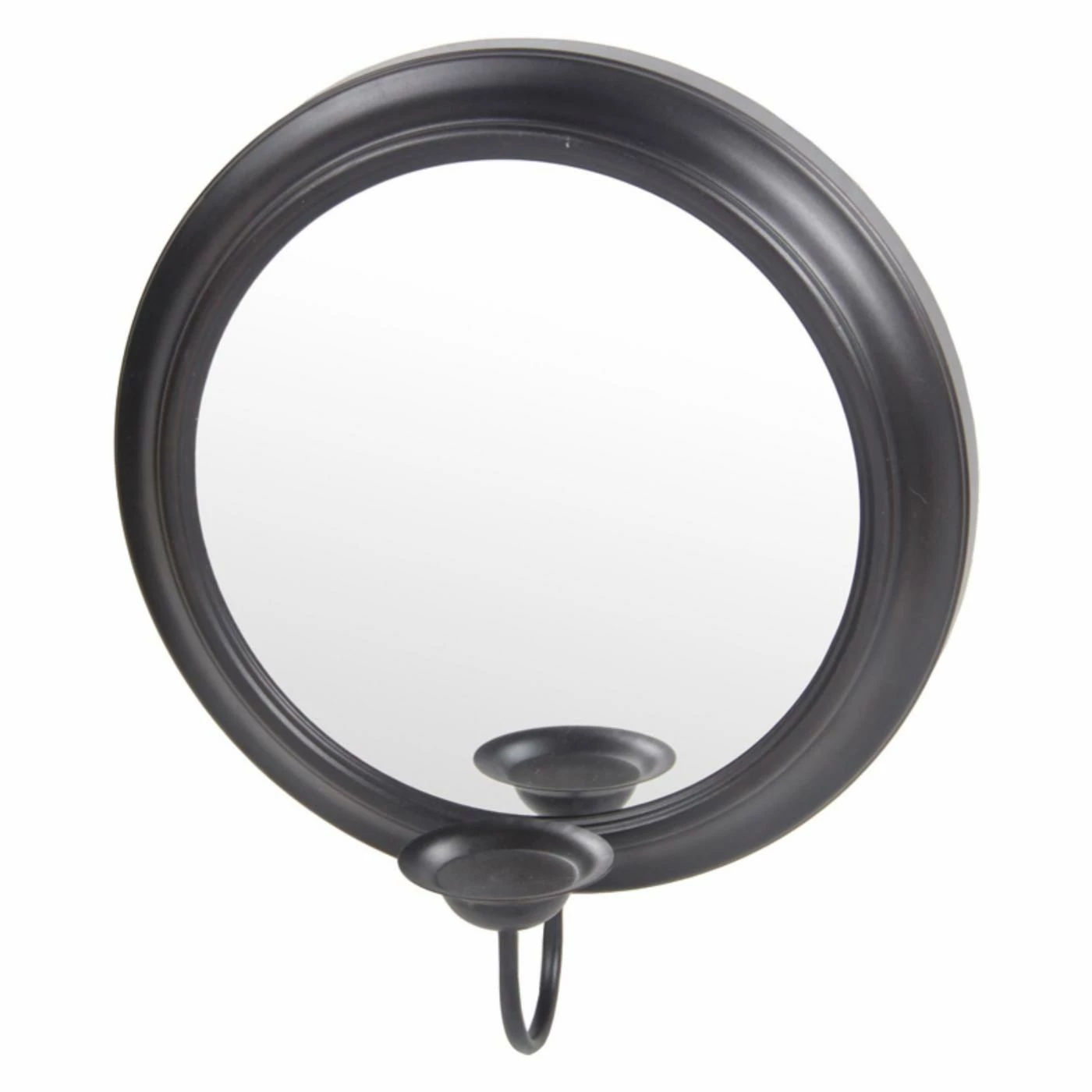 Create a warm, inviting look in your home when you display the Privilege International Metal Wall Mirror – 18W x 21H in. crafted with a black steel finished metal frame. This contemporary mirror has a round shape with a beveled border to give it a classic look. A small candleholder is attached to the front to help you create a relaxing atmosphere thanks to the candle’s flickering glow.