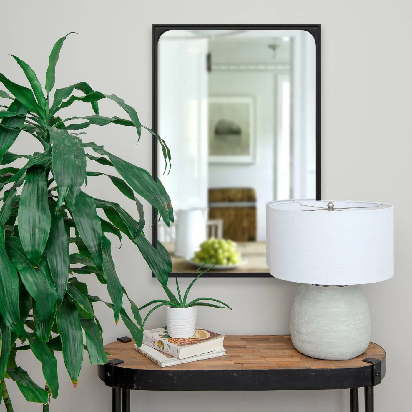 Elevate any room with the Renwil Sorella Black Wood Framed Wall Mirror – 24W x 36H in., featured with a carved wood frame finished in a bold black hue. This rectangular wall mirror is accented with rounded inner corners for a touch of modern charm. From a bedroom to your living space, it’s sure to add a touch of bright reflection combined with sleek, subtle style.