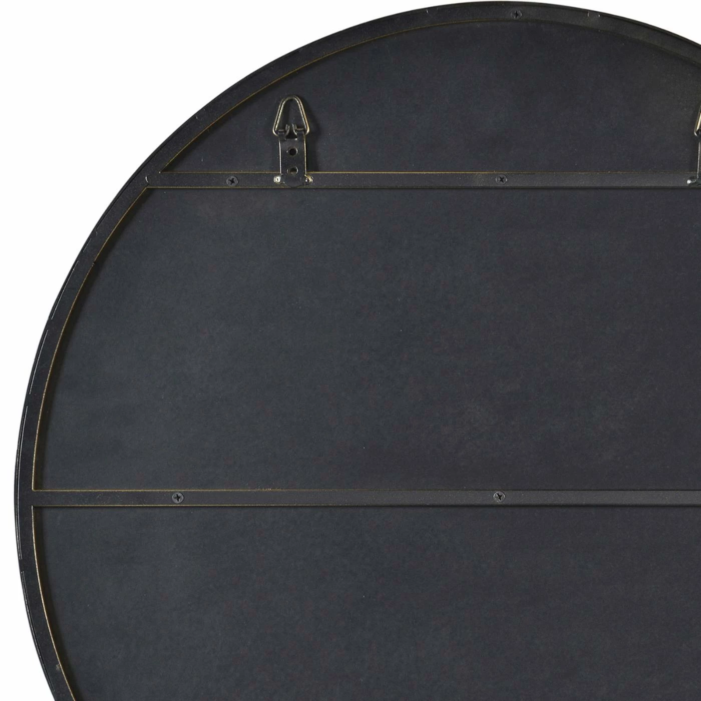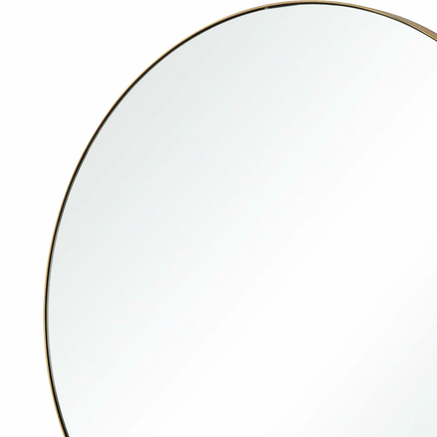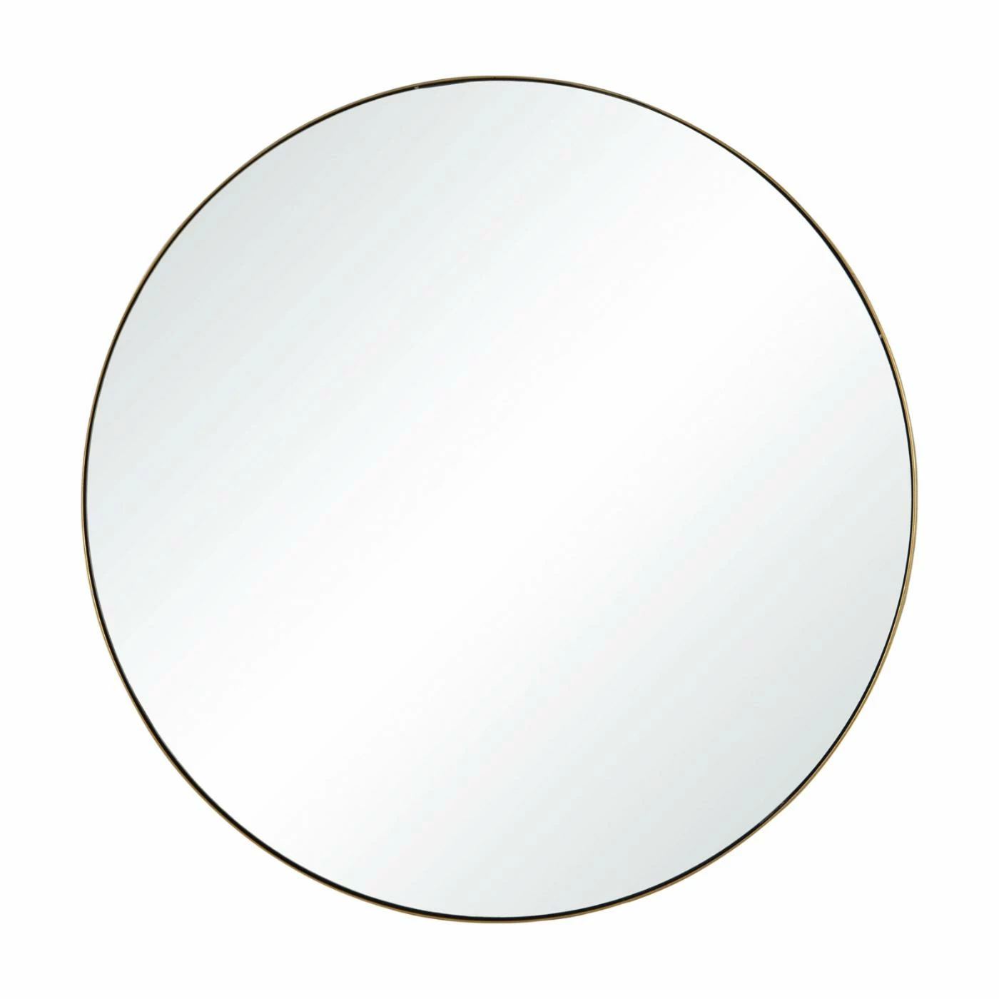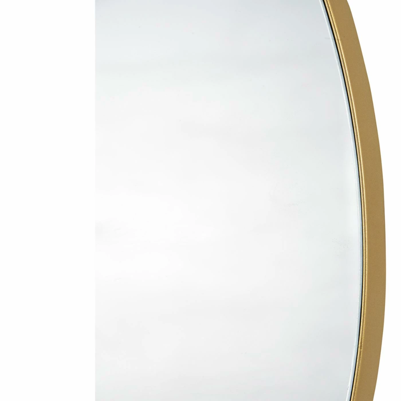 The Renwil Witham Wall Mirror – 24 diam. in. adds a glamorous accent above an entryway table or hung in a modern bathroom. This wall mirror features a spherical shape with a thin metal border painted in a gold finish. Hanging hardware is conveniently attached to the back.