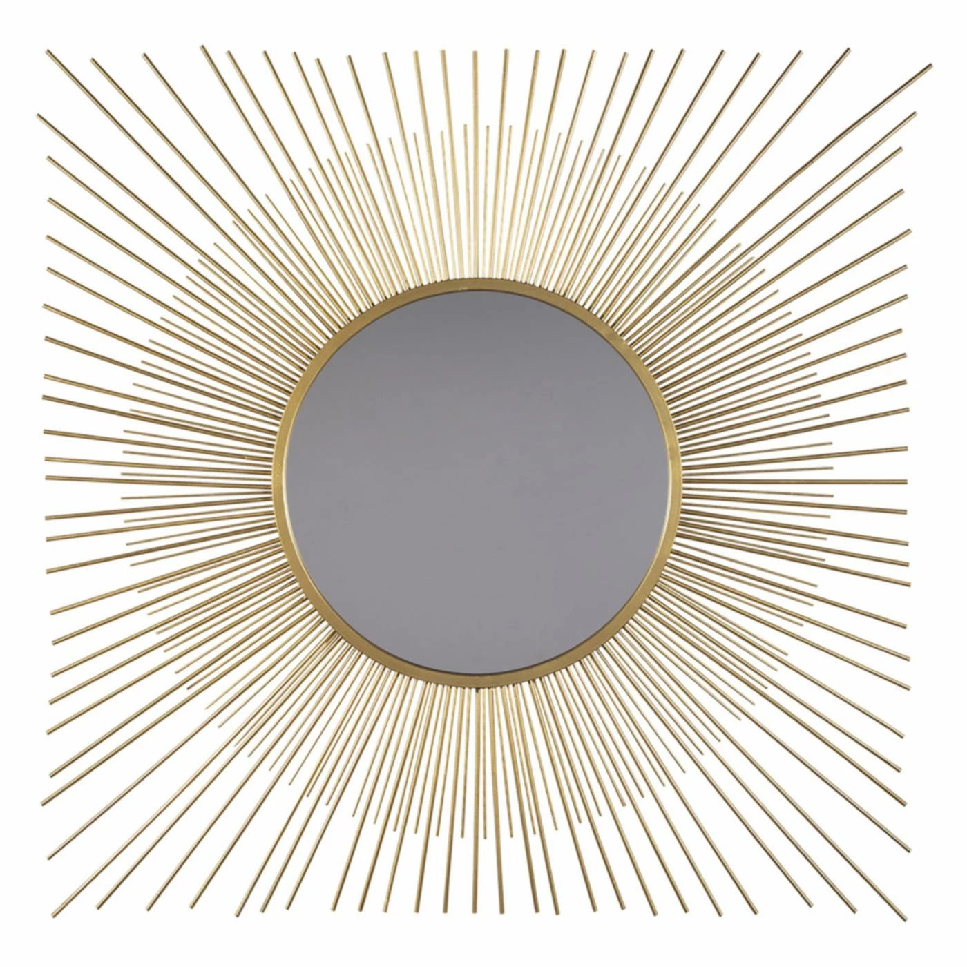 Gold metal spokes radiate outward from a circular, mirrored glass panel in the contemporary design of the Signature Design by Ashley Elspeth Sunburst Design Wall Mirror – 42W x 42H in. The mod sunburst mirror is ready to hang with a keyhole bracket attached to the back.