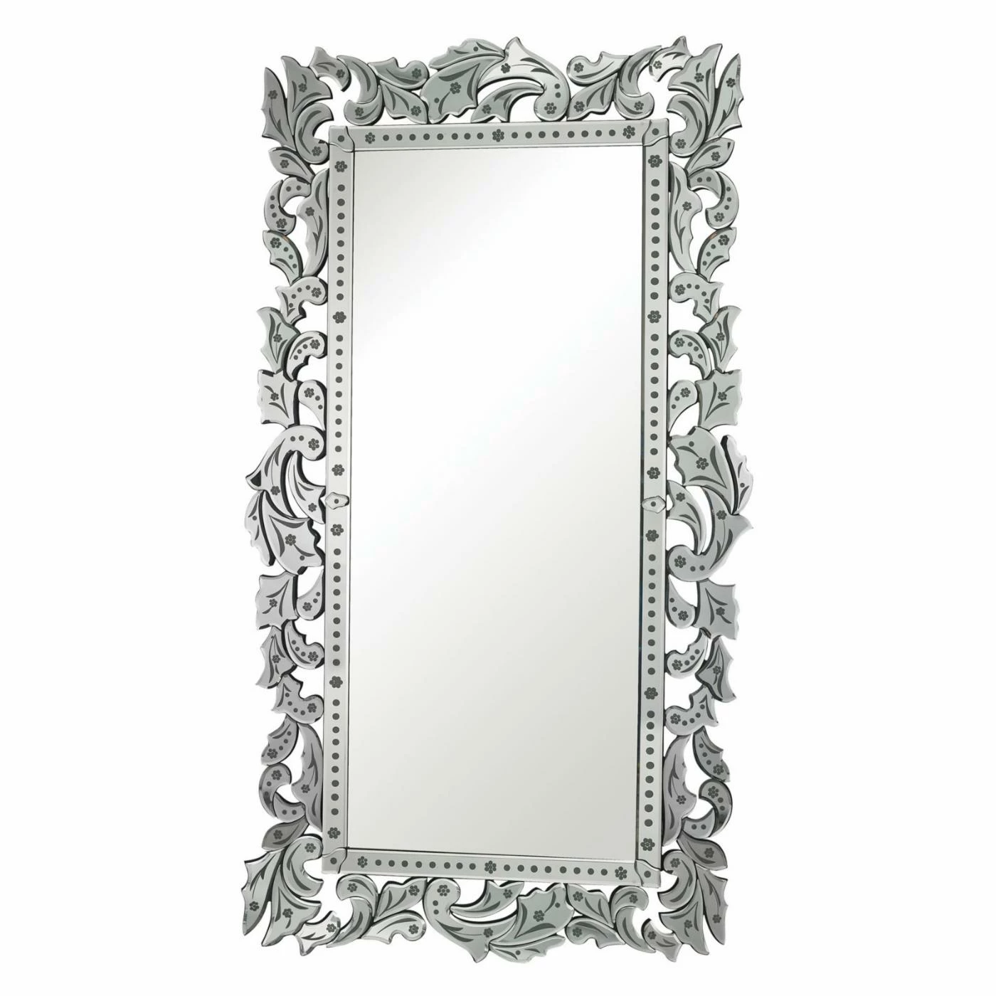 The mirrored frame of this Sterling Reede Venetian Wall Mirror – 40W x 72H in. is comprised of hand-cut beveled mirror pieces that form its vine and scroll pattern. Each mirror piece in the frame is etched with a floral pattern. This wall mirror may be hung vertically or horizontally.