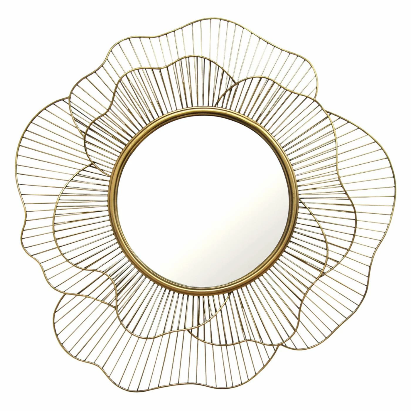 Look into this Stratton Home Decor Stella Wall Mirror – 28.25W x 28.25H in. and see yourself. The large circular mirror is framed in gold, surrounded by a flower petal wire sculpture that reaches out to you.