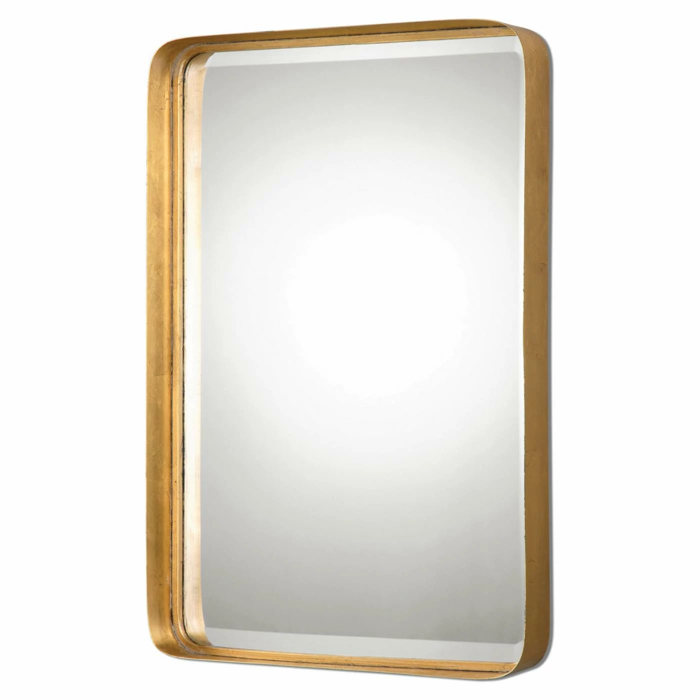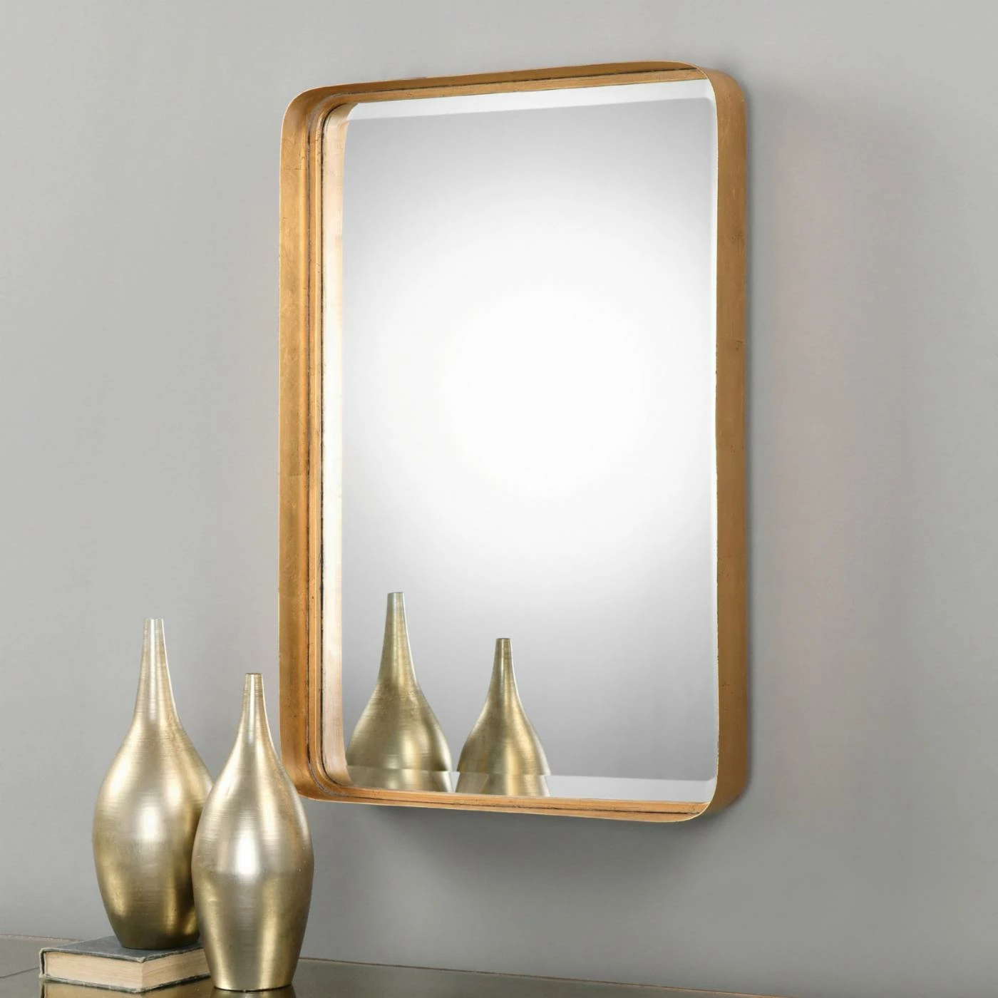 The transitional-style Uttermost Crofton Wall Mirror – 20.13W x 30.25H in. makes any wall look better. This elegant design is made of a thick metal-strap frame finished in lightly antiqued gold leaf that traces around the glassβs generous 1.25-inch bevel.