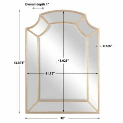 An inspired choice for any room, the Uttermost Francoli Arched Wall Mirror – 32W x 43.88H in. features a hand-forged metal frame with sweeping curves, scooped corners, and a lightly antiqued gold-leaf finish. The shapely mirrorβs most promising detail, however, is the reflection itself, divided into ornate panes and embellished with a generous 1.25-inch bevel.