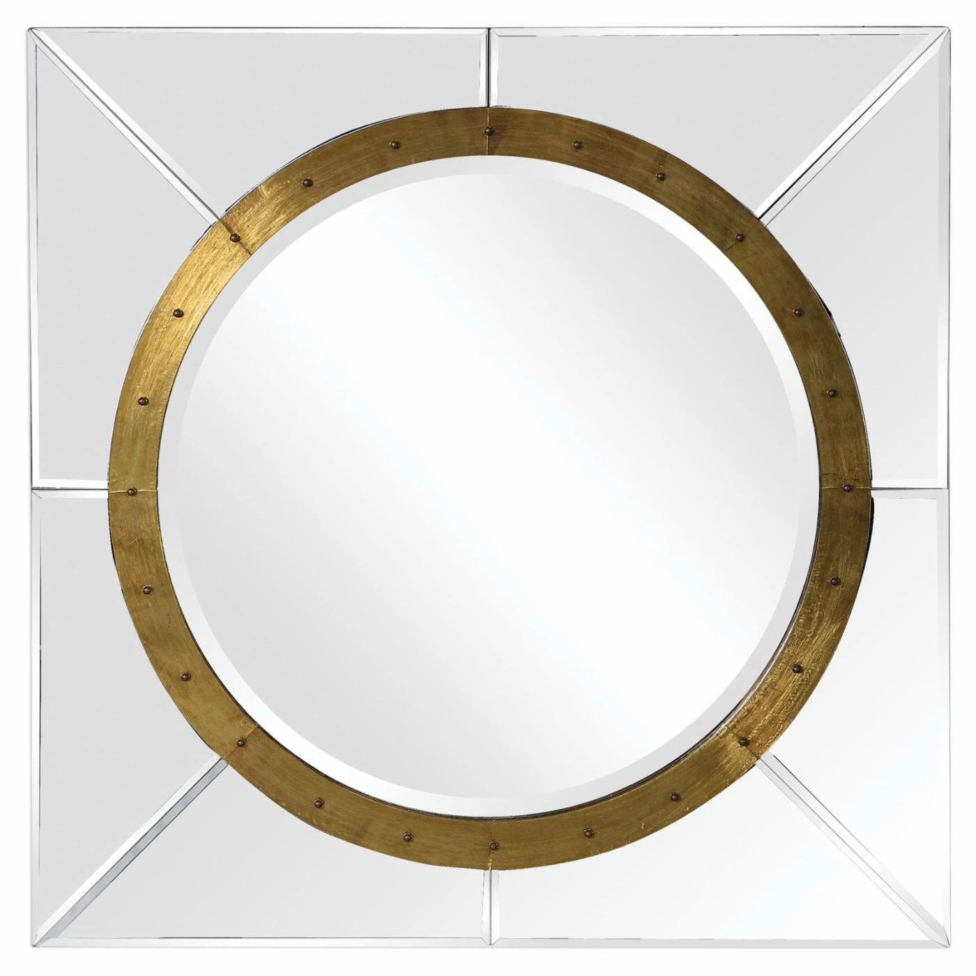 Instead of a frame, the Uttermost Maya Square Wall Mirror – 30.7W x 30.7H in. features a raised center cladded in antiqued copper sheeting. The industrial glam look of this wall mirror is enhanced by exposed screw heads and an antiqued copper finish. Its mirrored panels surround a round mirror with generous bevel. This is the wall mirror your space deserves.