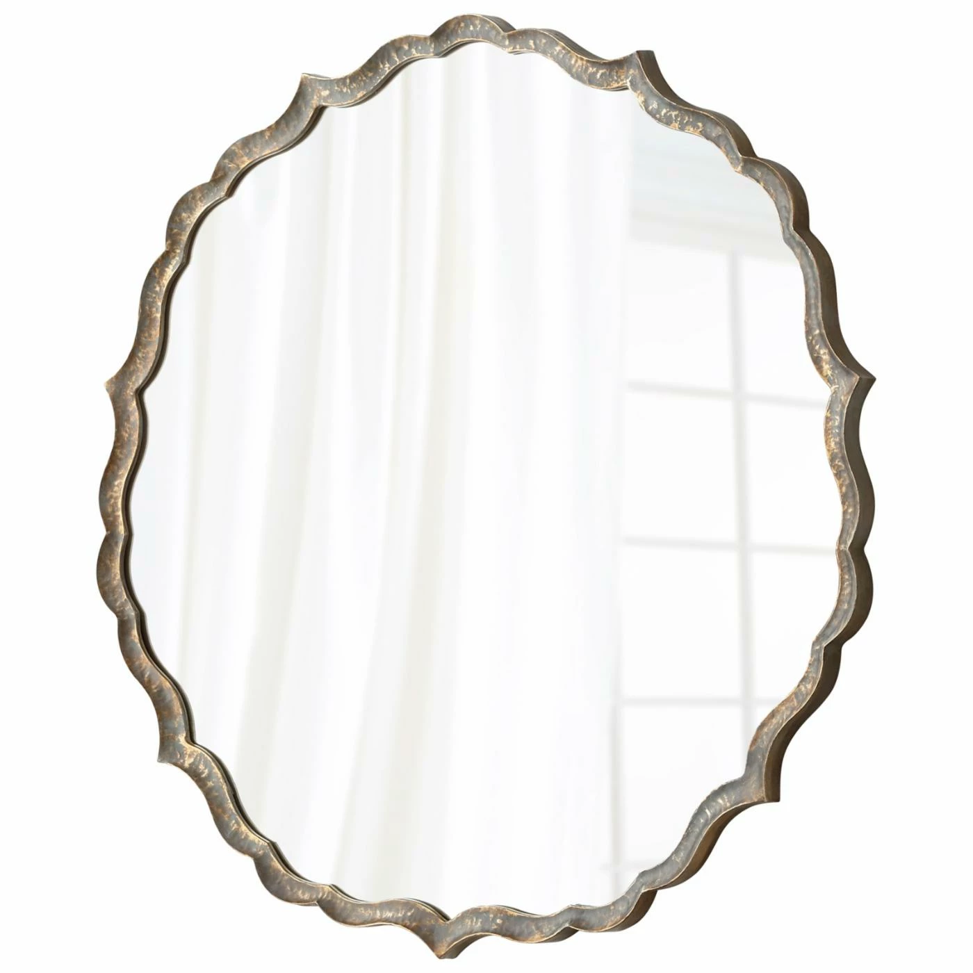 Carefully distressed, gray-scalloped metal surrounds sleek glass in the design of the Cyan Design Radiance Mirror – 44.25 diam. in. With its weathered appearance, the mirror is a perfect match for shabby chic, French country, and upscale farmhouse dΓ©cor.