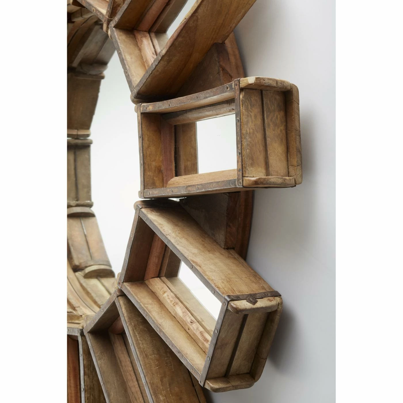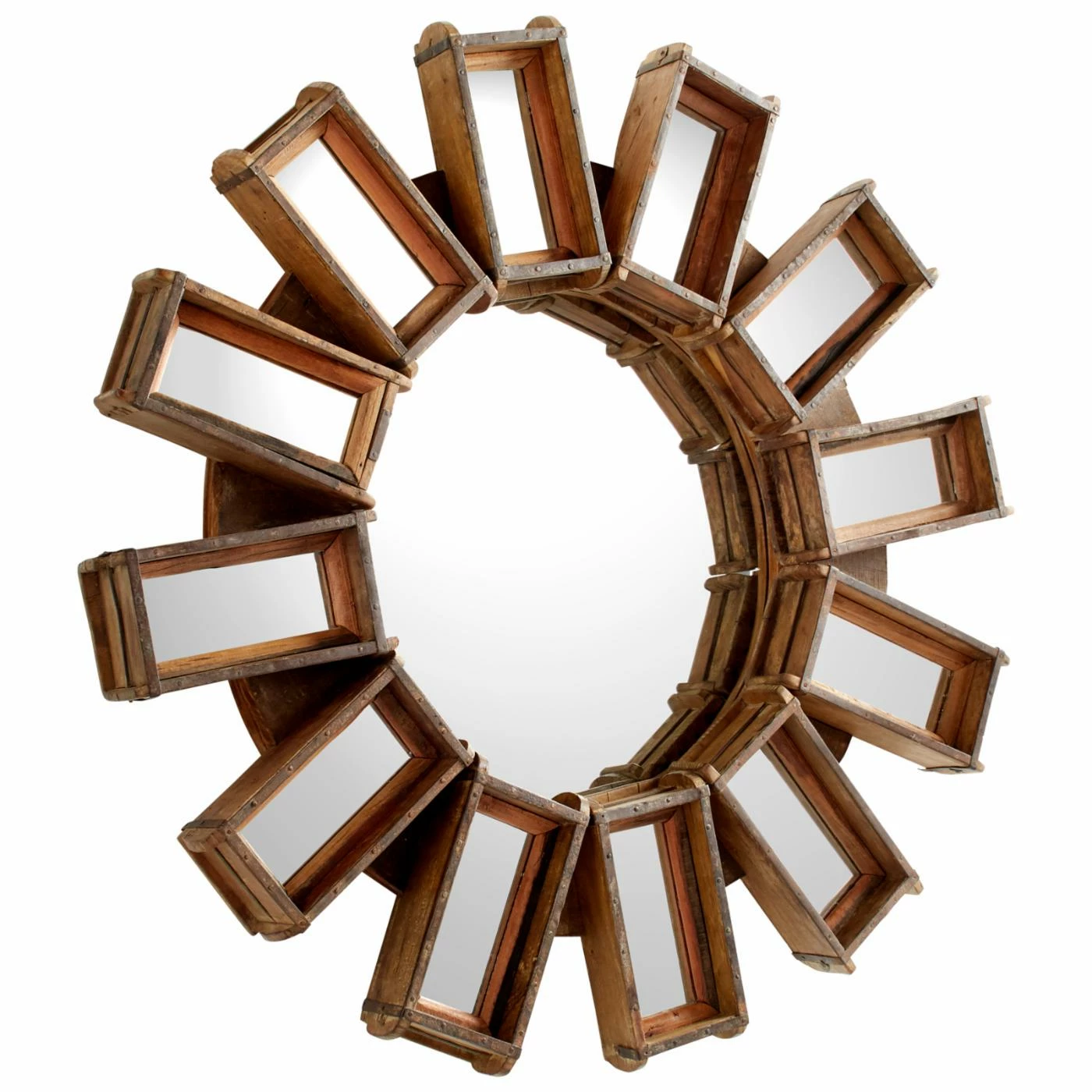 Twelve dimensional wood boxes hold gleaming rectangular mirrors in the flower-inspired design of the Cyan Design Zenobia Mirror – 46 diam. in. The petals surround a circular mirror set into a sturdy, natural brown-finished wood frame.