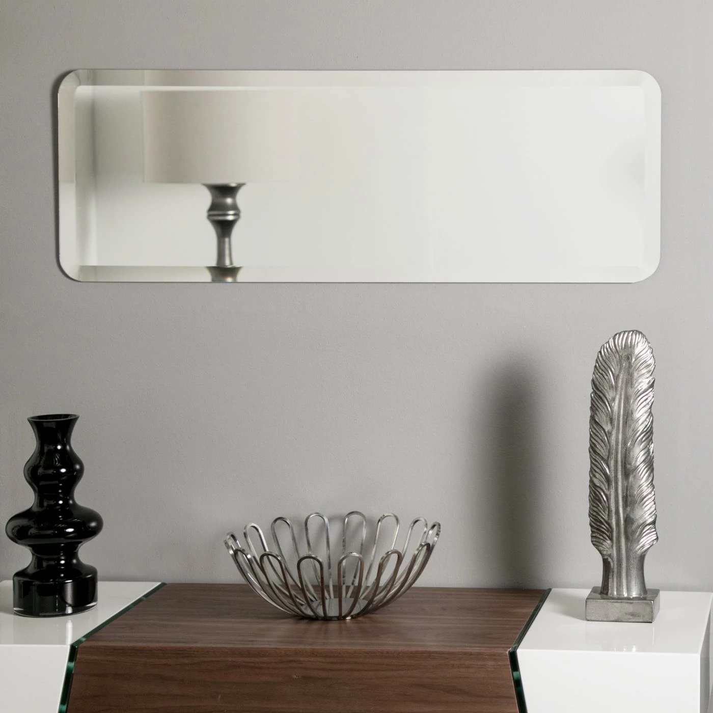 Make a sleek, modern statement above vanities, consoles, and more with the Decor Wonderland Shelly Long Frameless Mirror – 13.75W x 39.5H in.. Featuring a striking frameless design, this mirror is as chic and contemporary as it gets. Its silver construction is accented with beveling and rounded edges for a crisp aesthetic.