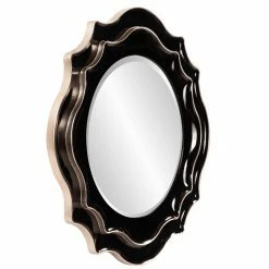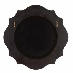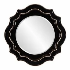 Featuring a two-layer scalloped design, the Elizabeth Austin Mirabelle Mirror – 37 diam. in. looks like a flower. This round mirror features a beveled edge. The frame is made of polyurethane and finished in a glossy black color. The edge is accented with a silver finish. For easy hanging, it’s equipped with hanging hardware.