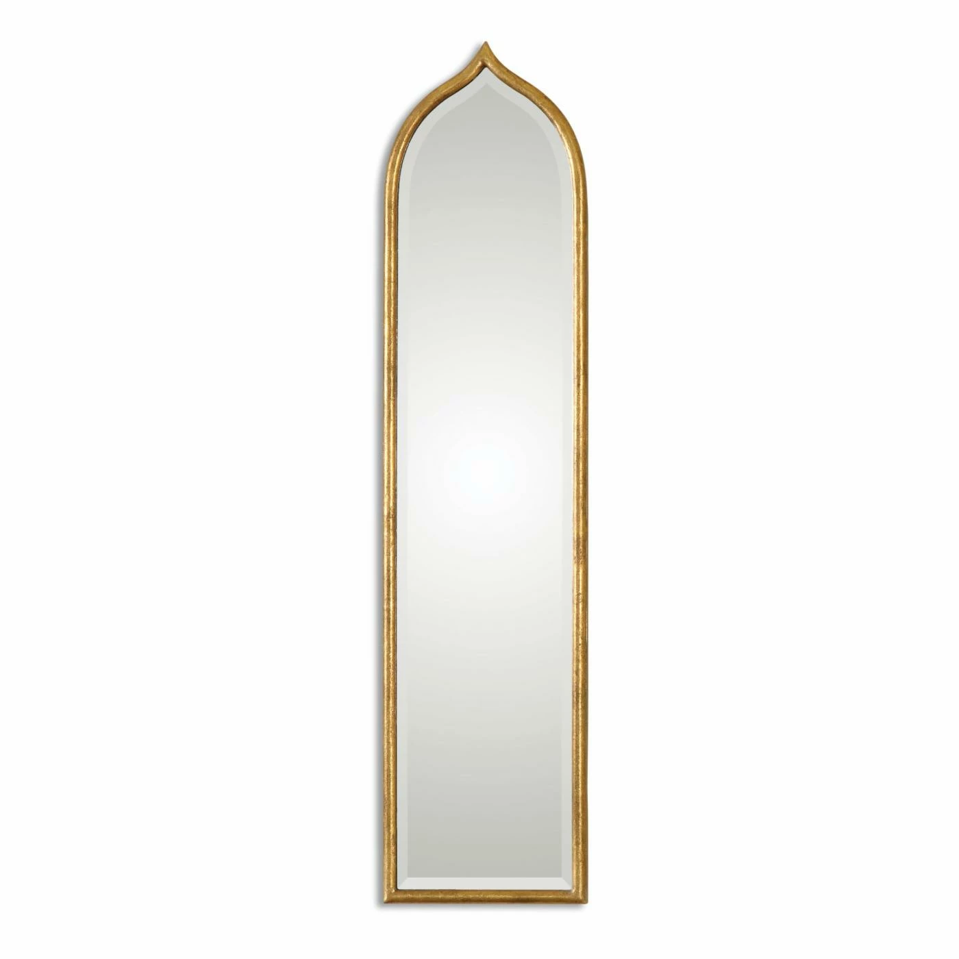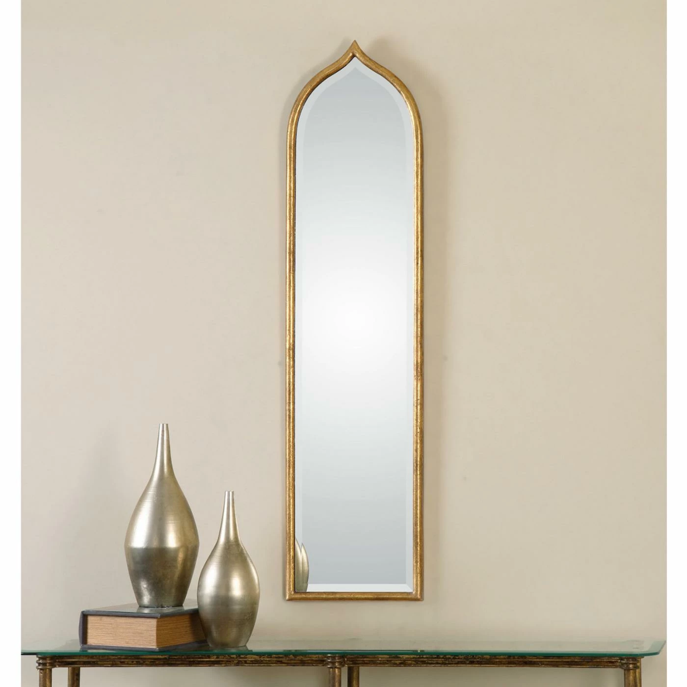 Slim and gracefully arched, the HN Home Lambertville Boho Gold Mirror – 12W x 50H in. brings exotic majesty home. The metal frame is finished in lightly antiqued gold leaf. The shaped mirror within has a generous beveled edge.