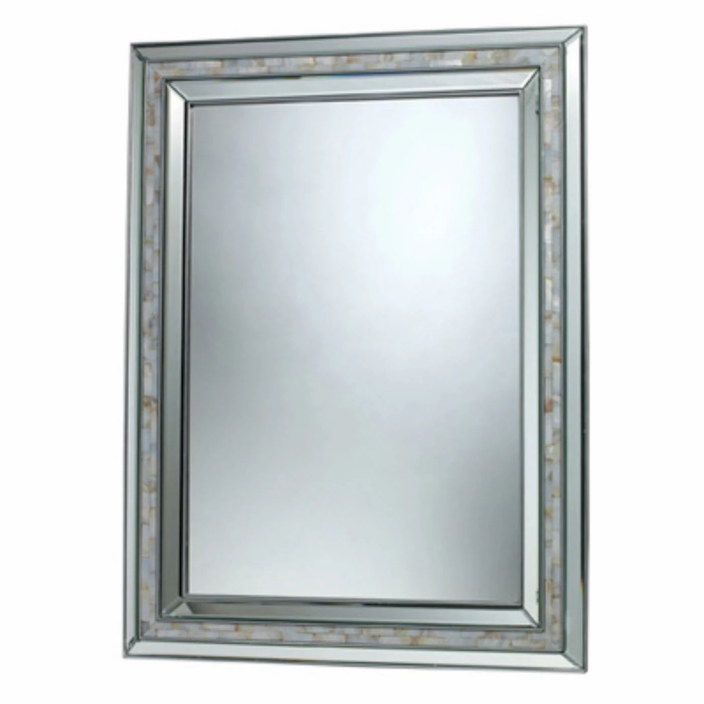 Put a pretty gleam in the hallway with the Sterling Sardis Brushed Steel and Mother Pearl Mirror – 29W x 39H in. Crystal-clear glass is surrounded by a rectangular brushed steel frame accented with a central strip of mother-of-pearl. A composite wood frame at the back adds stability.