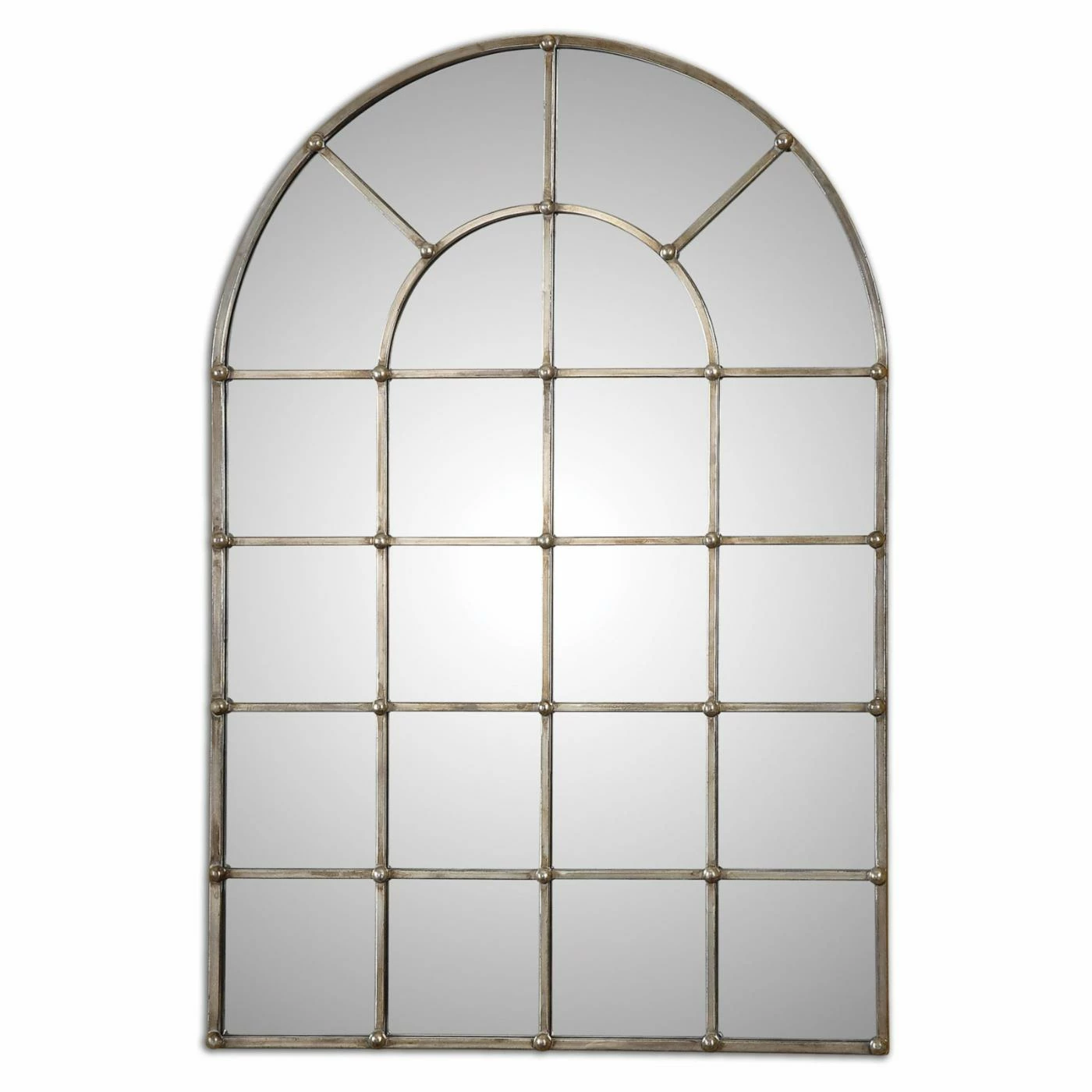 The Uttermost Barwell Arched Window Mirror – 29.5W x 44.13H in. hangs vertically to bring you an impressive wall accent that appears more like a window than a mere reflection. This arched design features a generous sheet of glass with a hand-forged metal frame that possesses a window pane motif and oxidized plated-silver finish for added sparkle.