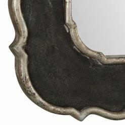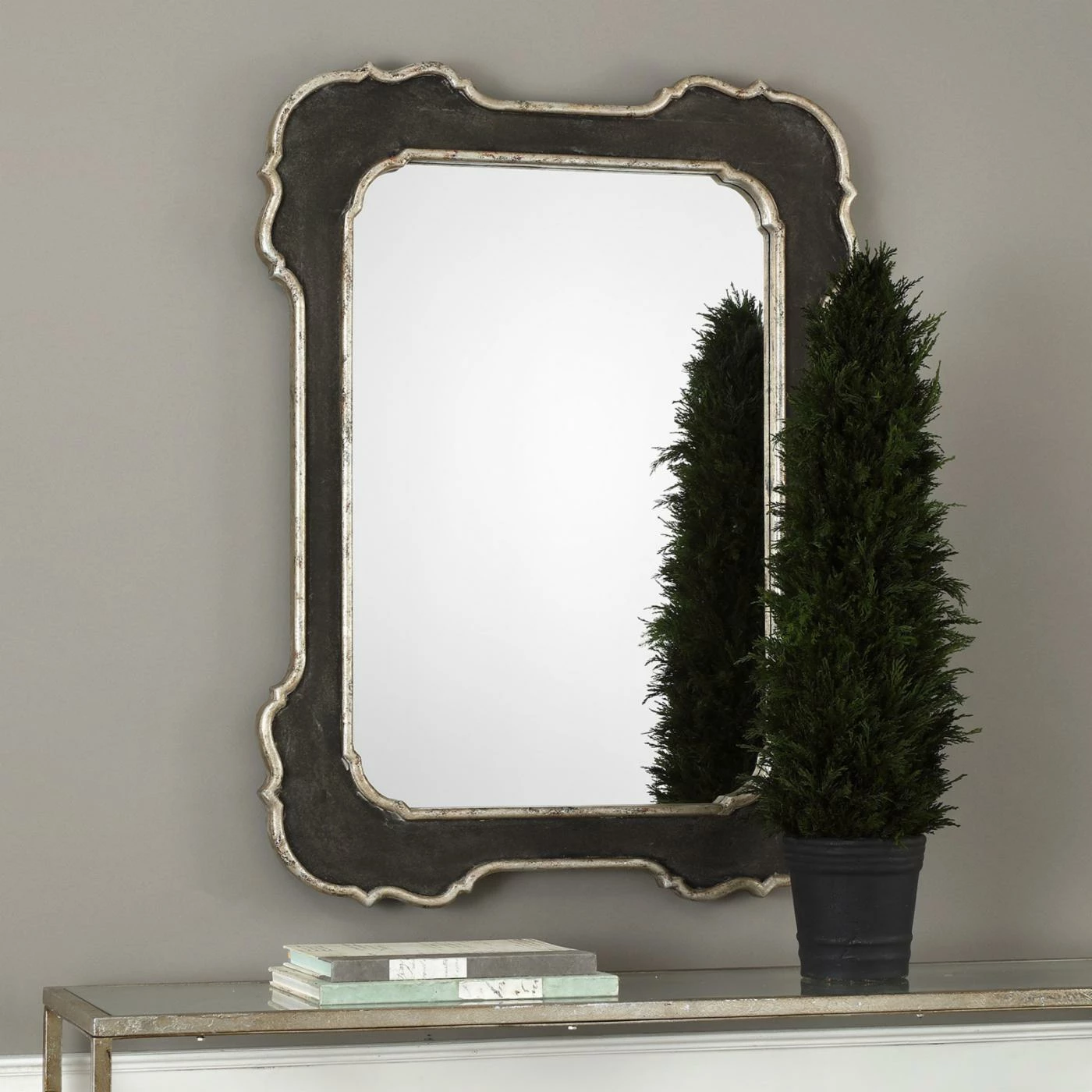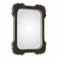 With a gracefully curvaceous silhouette, the Uttermost Bellano Aged Black Mirror brings European-inspired style to your space. This unique mirror is enhanced with a solid wood frame completed in a textured aged black finish. A raised inner and outer edge completed in silver leaf lends the mirror a modern touch.