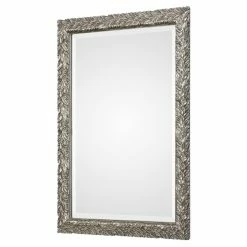Overlapping leaves in a burnished metallic silver finish make the Uttermost Evelina Silver Leaves Mirror its modern organic shimmer. The rectangular mirror boasts a generous beveled edge. For designer versatility, this wall mirror mounts horizontally or vertically.