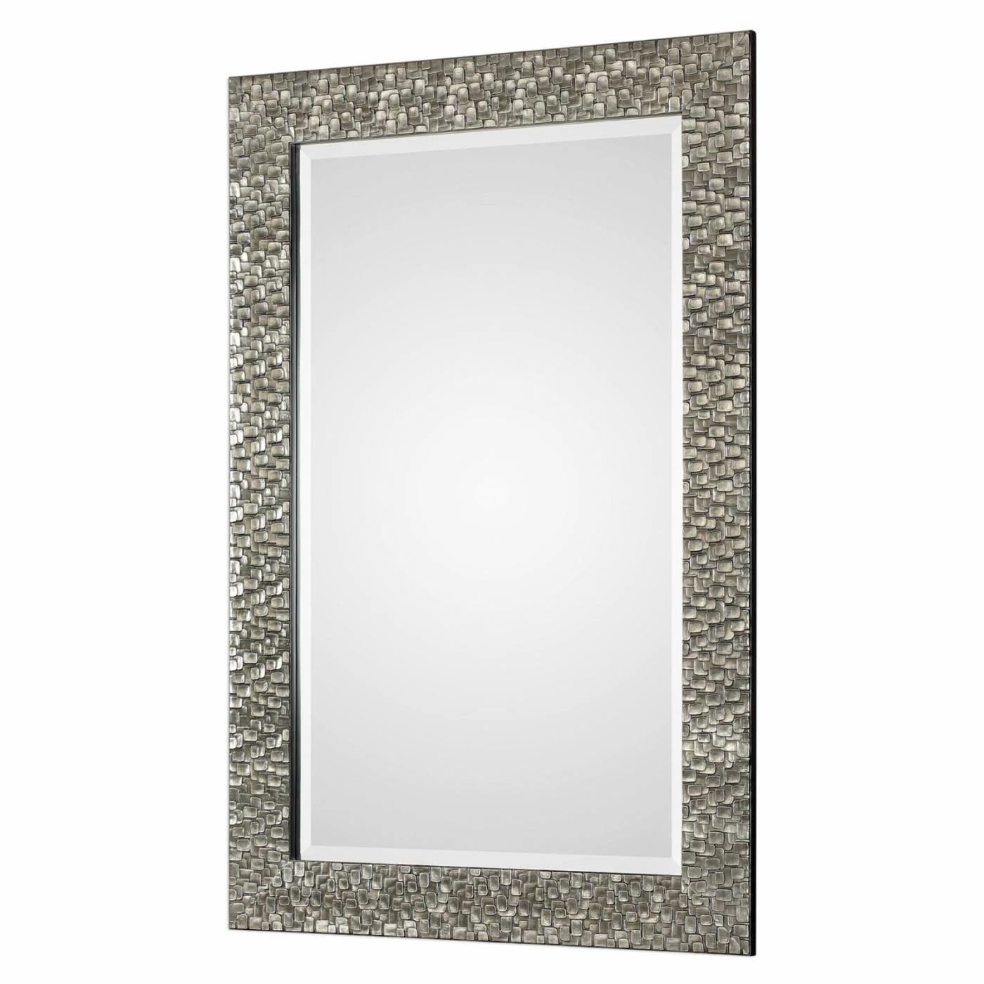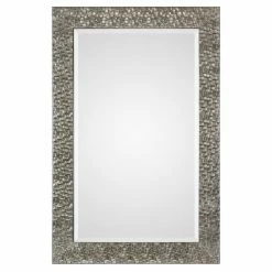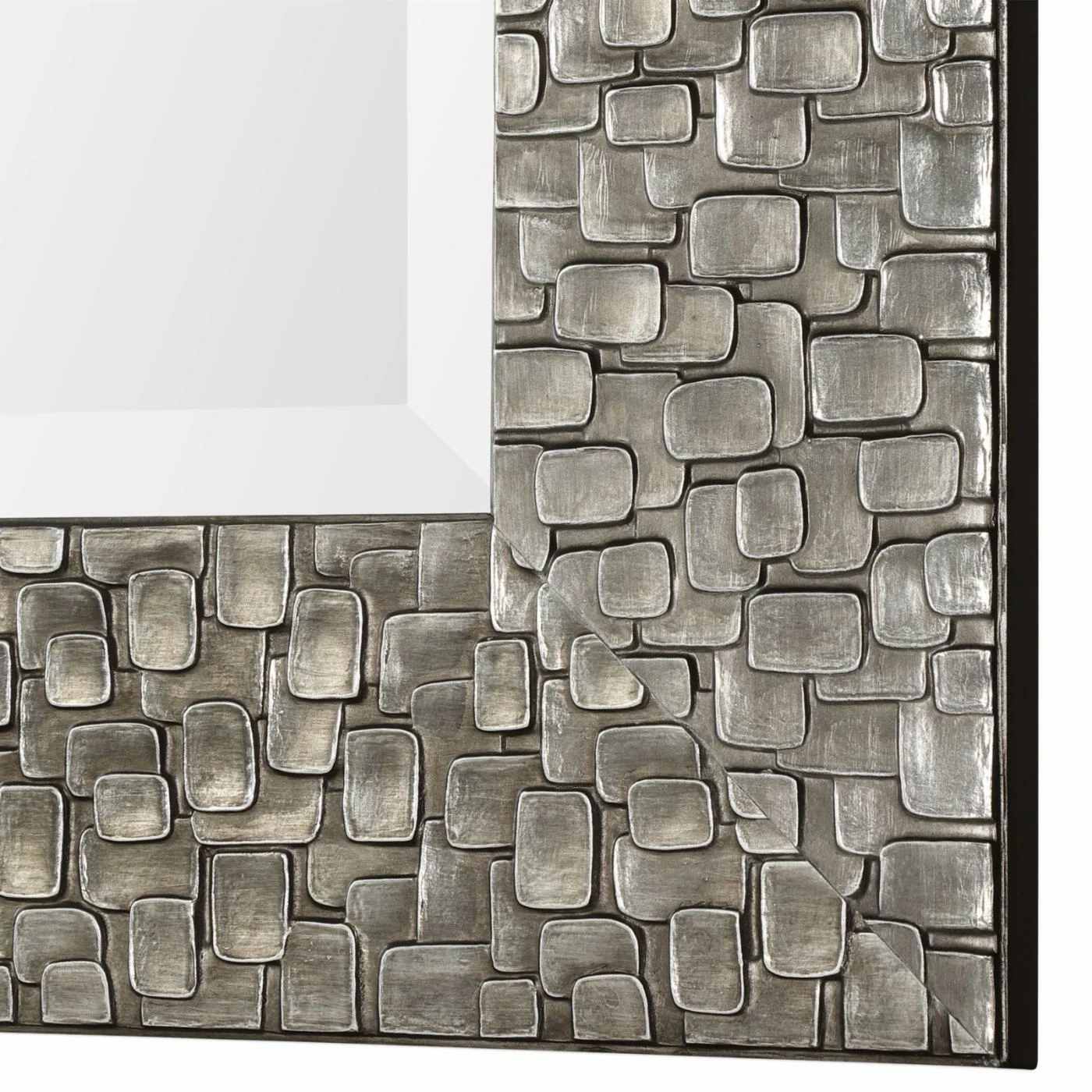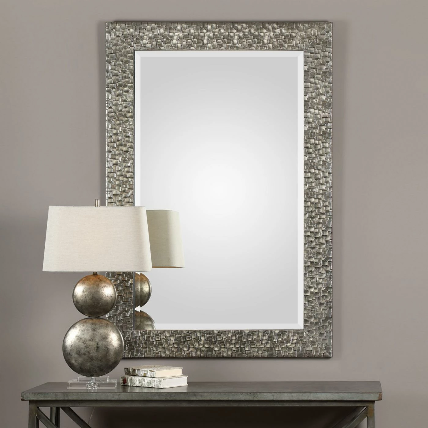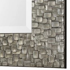 The richly textured Uttermost Kanuti Metallic Gray Mirror gets a glamorous touch from its metallic silver finish with light gray glaze. Its rectangular mirror features a wide bevel that shimmers in the light. Hang this large mirror vertically or horizontally, as you choose.