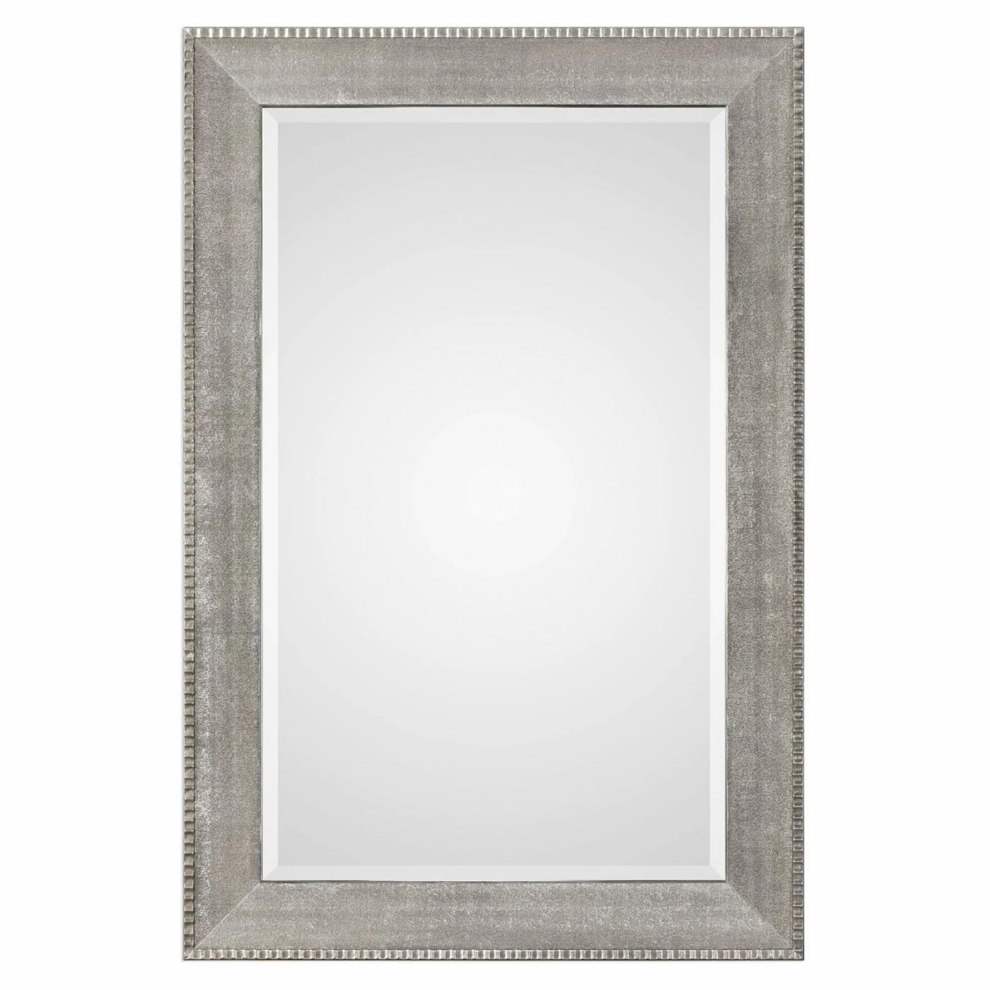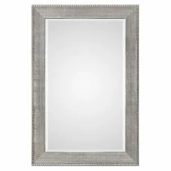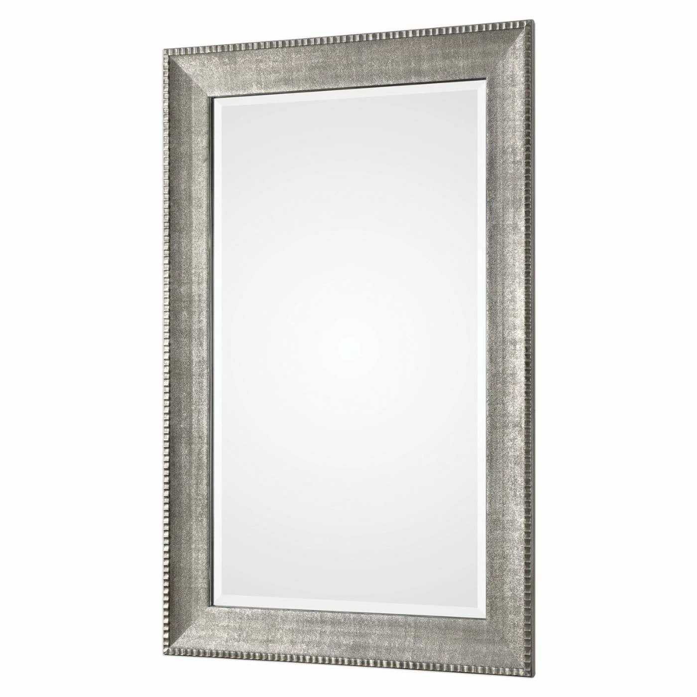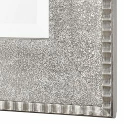 The richly textured Uttermost Leiston Metallic Silver Mirror features a sloped profile in metallic silver and a fluted edge in antiqued silver finish. Its rectangular mirror has a generous bevel that shimmers in the light. Mount this generous wall mirror vertically or horizontally.