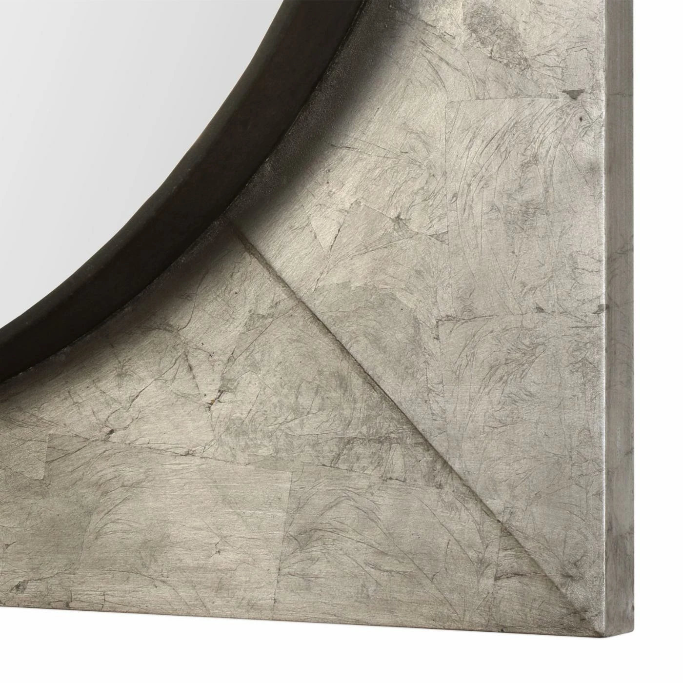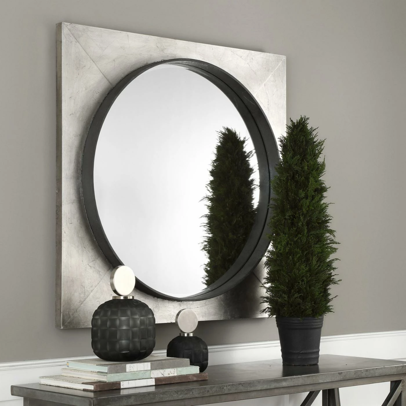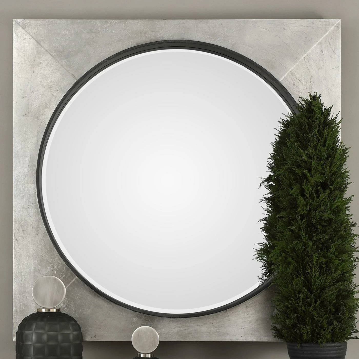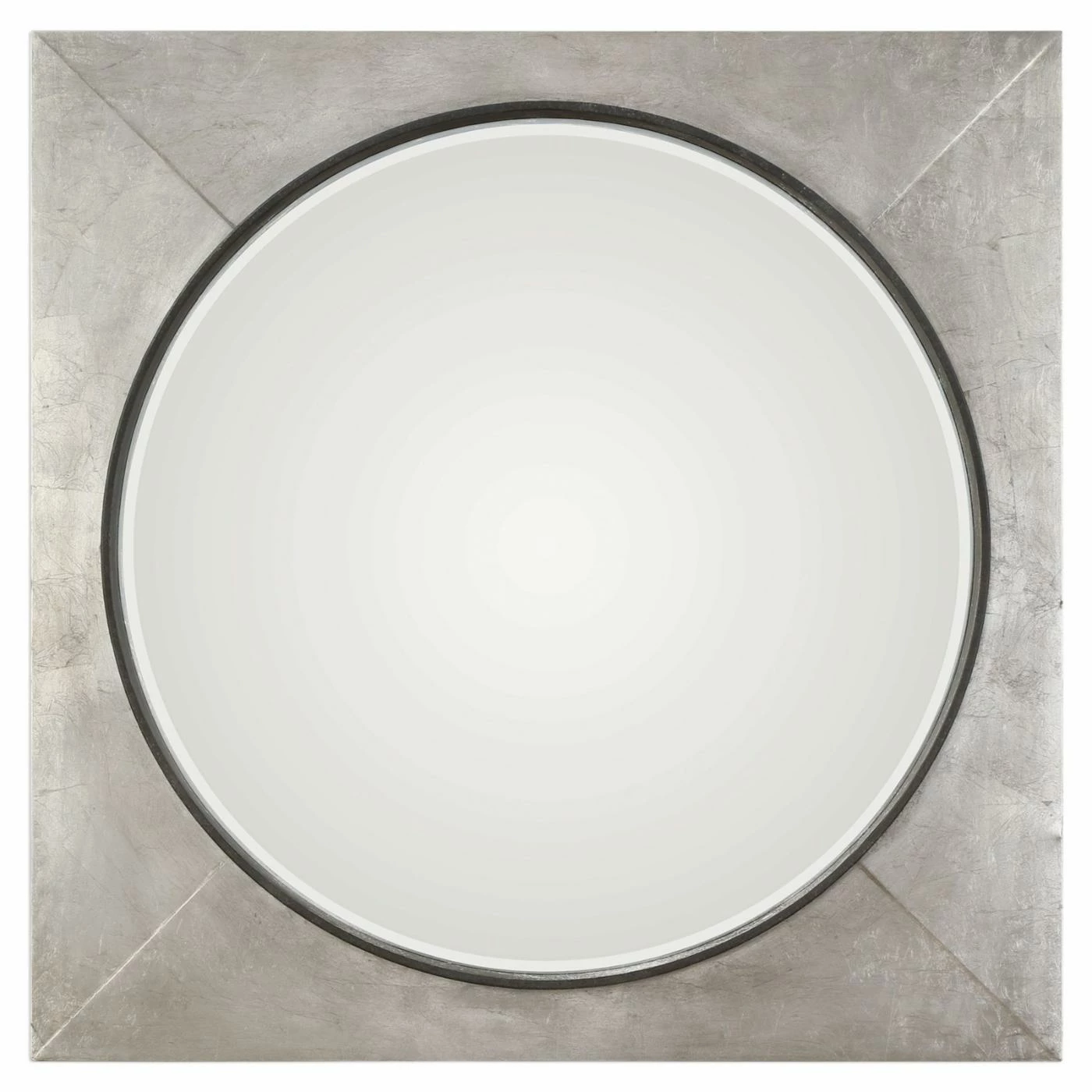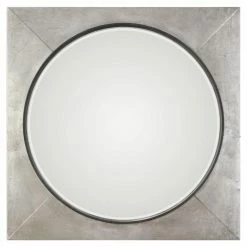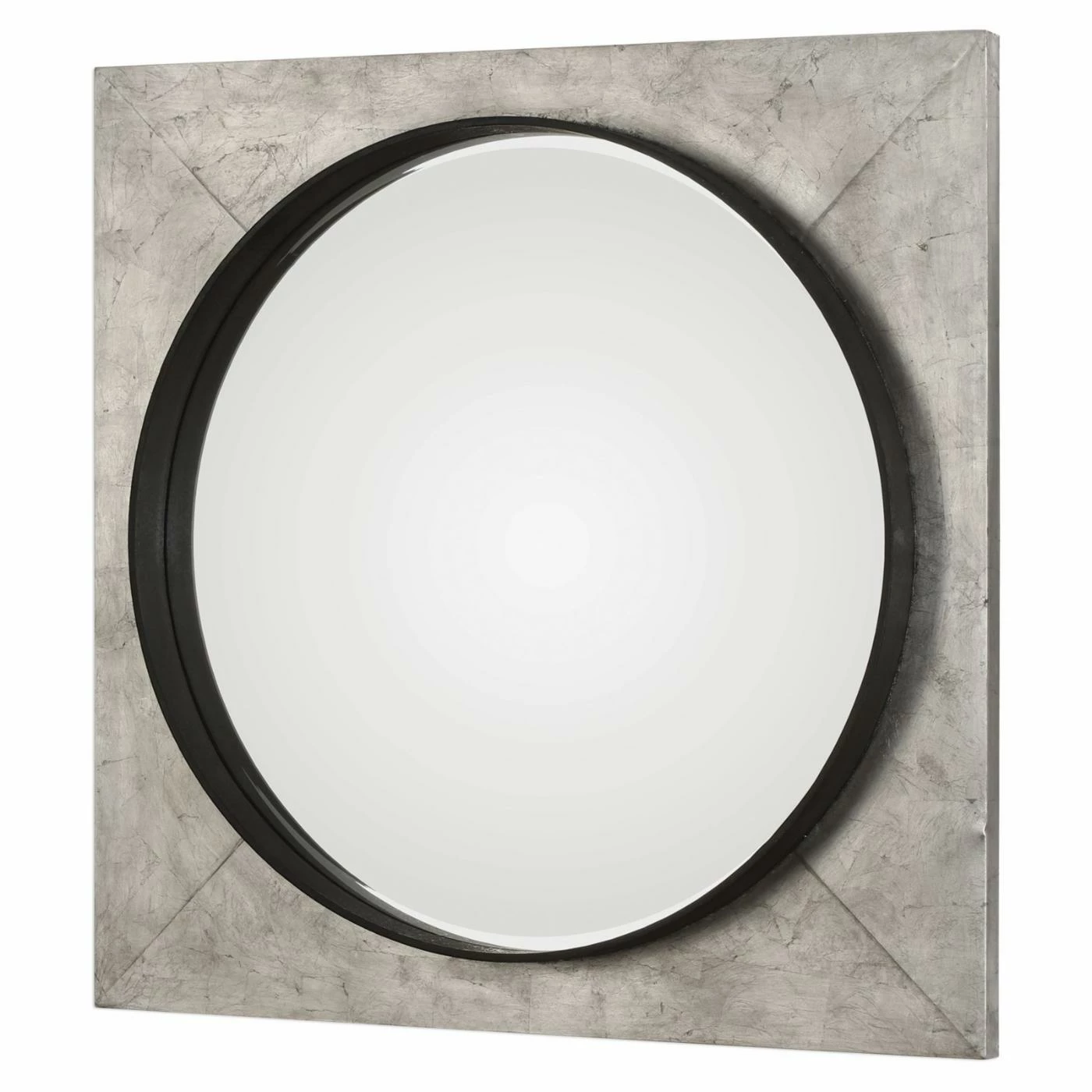 The geometric Uttermost Solomon Metallic Silver Mirror features a generous, squared iron frame and circular mirror. It boasts a hand-applied metallic silver leaf finish with raised rustic black inner lip. The mirror within has a generous bevel that shimmers in the light.
