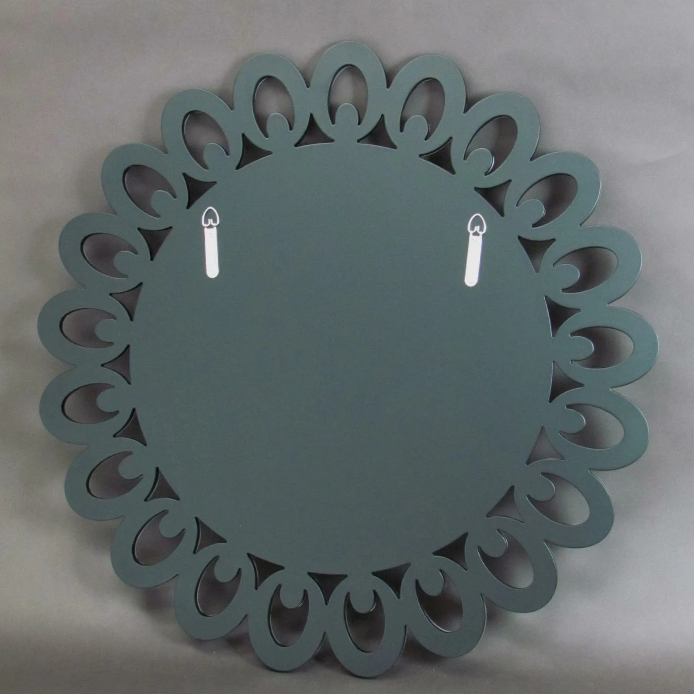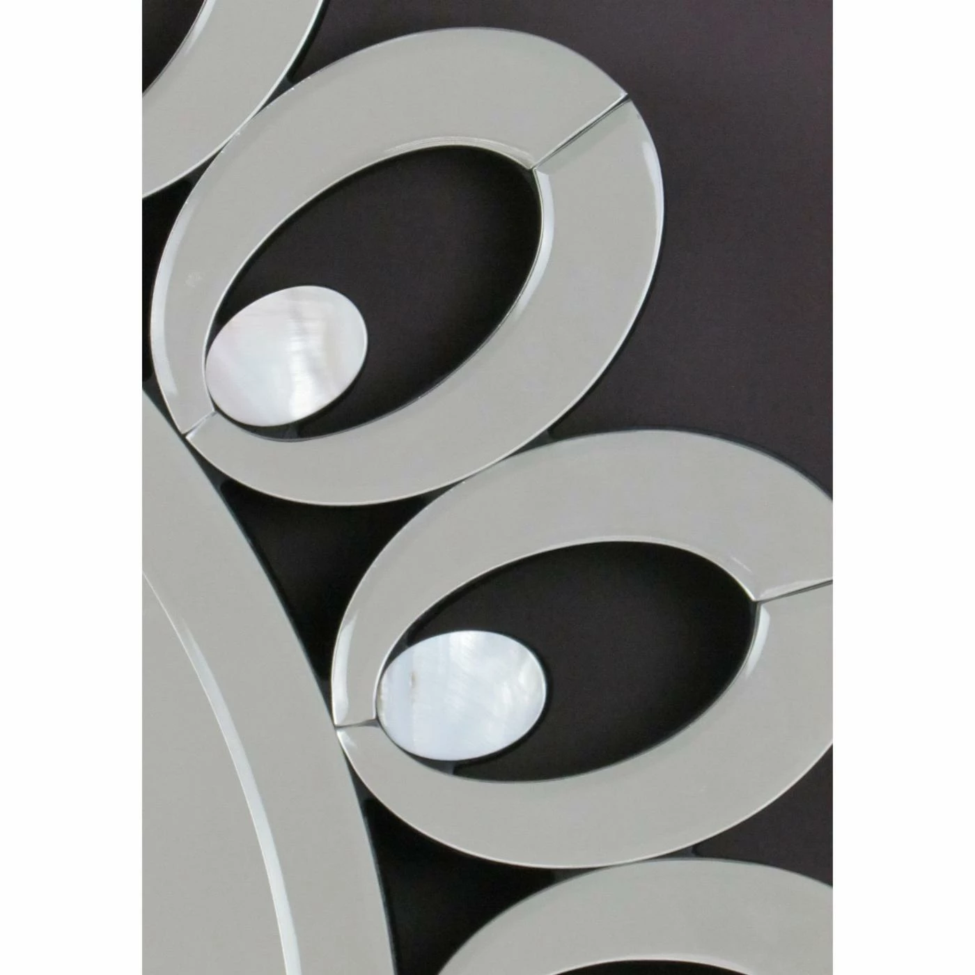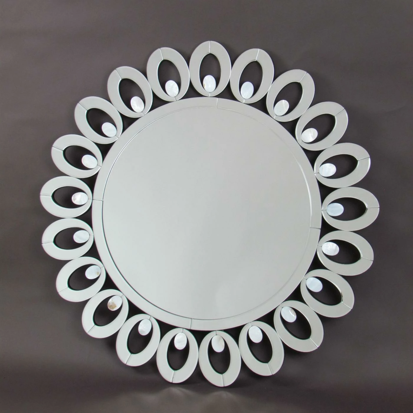 The Wayborn Mother of Pearl Beveled Round Mirror is a round mirror made of beveled glass. Authentic mother of pearl accents add a modern and stylish touch to this mirror.